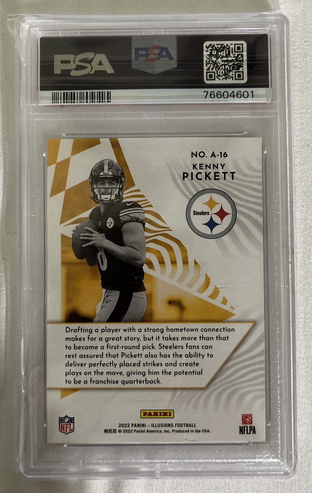 The 2022 Panini Illusions Kenny Pickett rookie trading card features the player in his Pittsburgh Steelers and Philadelphia Eagles uniforms. Graded as a PSA Gem Mint 10, this card is a standout in any football card collection. As an autographed card, it showcases Pickett's signature along with his image, making it a valuable piece for fans and collectors. The card is part of the 2022 Panini Illusions set and is a must-have for NFL and trading card enthusiasts.