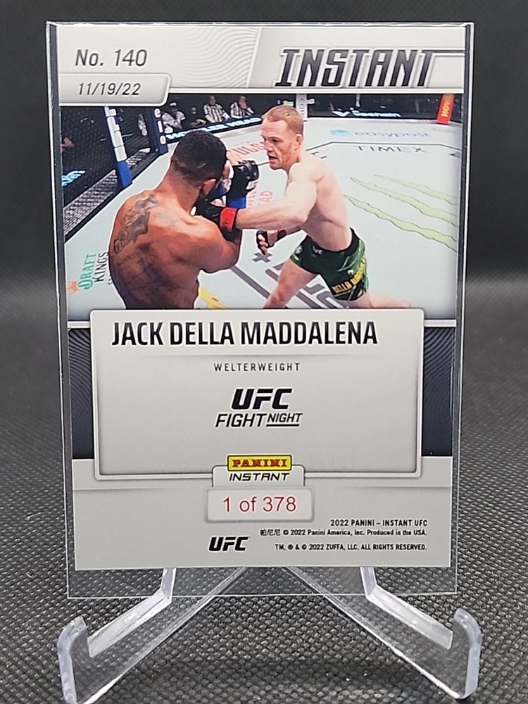 The product is a 2022 Panini Instant UFC trading card featuring Jack Della Maddalena, categorized as a Sports Trading Card. It is part of the base set and marked as a rookie card, with a print run of 378. The card number is 140, and it is manufactured by Panini for the 2022 season.