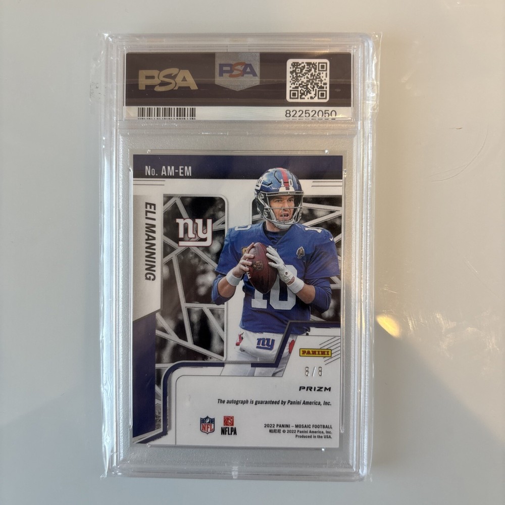 Elevate your football memorabilia collection with the 2022 Mosaic #AMEM Eli Manning GEM MT Auto Black Gold Choice, a rare and coveted sports trading card. This exceptional piece, graded a perfect 10 by the Professional Sports Authenticator (PSA), captures the essence of the New York Giants' legacy with a stunning mosaic parallel design and the authentic autograph of the renowned quarterback. Limited to just 8 copies, this card is a unique treasure from the 2022 season, manufactured in the United States by Panini, a trusted name in sports collectibles. It's a celebration of Eli Manning's contribution to the sport, encapsulated in a sleek card stock form that promises to be the centerpiece of any NFL collection.