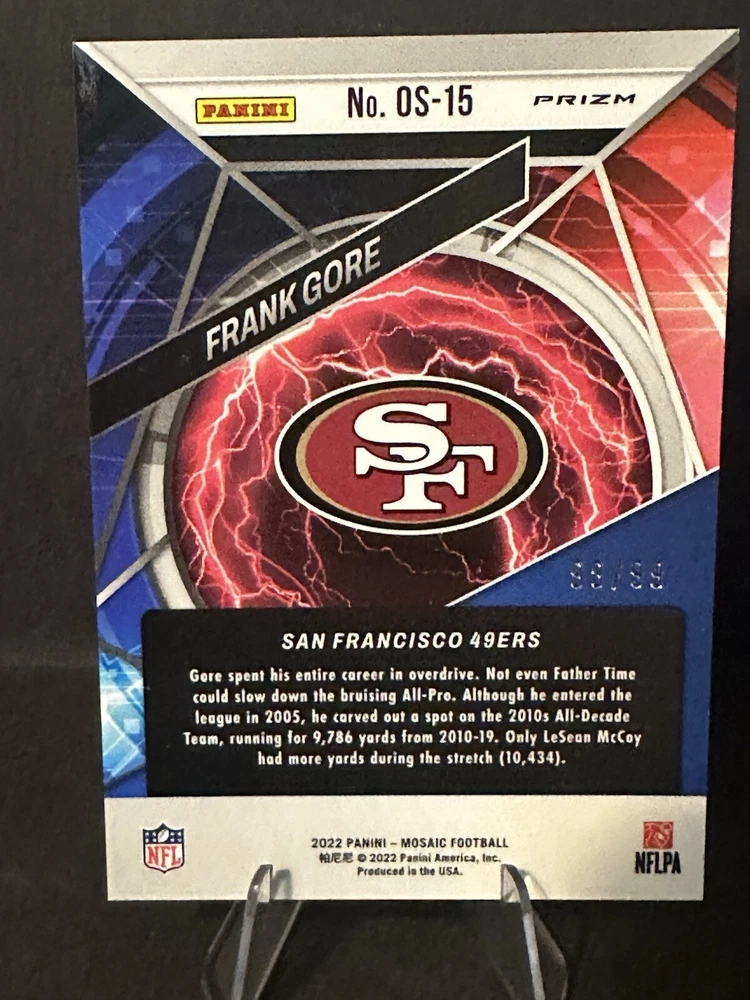 Card Number:OS_15League:National Football League (NFL)Print Run:99Sport:FootballTeam:San Francisco 49ersManufacturer:PaniniParallel/Variety:PrismSeason:2022Player/Athlete:Frank GoreFeatures:Serial NumberedSet:2022 Panini MosaicType:Sports Trading Card