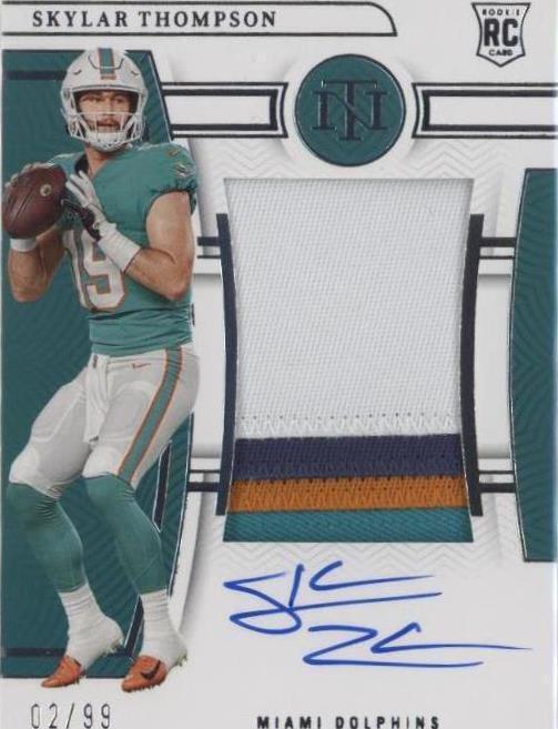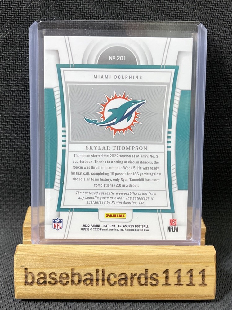 This 2022 Panini National Treasures Skylar Thompson trading card is a must-have for any Miami Dolphins fan or sports card collector. The card features a stunning 4-color patch with a true RPA #'d design, making it a unique and valuable addition to your collection. As a rookie card, this item is highly sought after and comes with a variety of features, including being serial numbered, stamped, and part of the exclusive Patch Auto parallel/variety. With its short print run of just 99, this card is a rare find that any NFL fan would love to own. Don't miss your chance to add this rare and valuable card to your collection today!