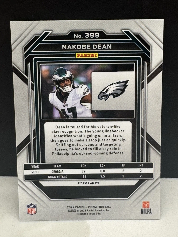 The 2022 Panini Prizm Nakobe Dean Rookie Card (#399) features Nakobe Dean, a player for the Philadelphia Eagles in the National Football League (NFL). This sports trading card is part of the Panini Prizm series, known for its high-quality cards and vibrant designs. The card is in near mint or better condition, making it a desirable collectible for football fans and trading card enthusiasts looking to add a rookie card of Nakobe Dean to their collection.