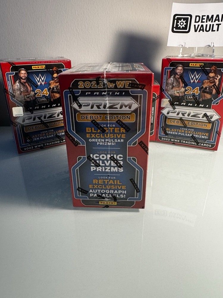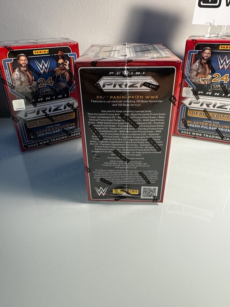 BRAND NEW - FACTORY SEALED READY TO SHIP The product is a 2022 Panini Prizm WWE Blaster Box, factory sealed and brand new, with free shipping included. This box contains sports trading cards featuring wrestlers from the WWE league. Manufactured by Panini, this box is part of the 2022 Panini Prizm WWE set, offering collectors the opportunity to add exclusive cards to their collection. Perfect for fans of wrestling and trading cards, this product is a must-have for any collector looking to enhance their collection with the latest releases from the WWE league.