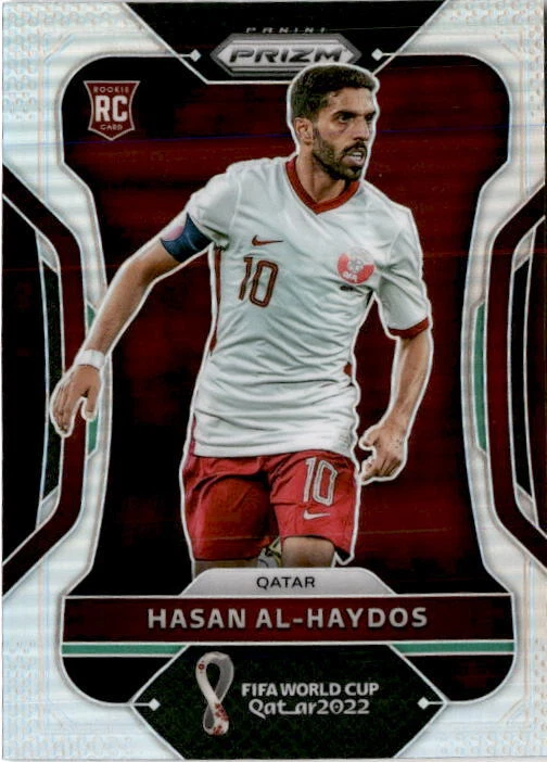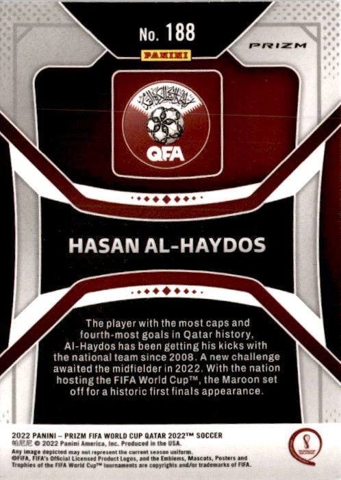 Set: 2022 Panini Prizm World Cup Card Number: 188 Insert Set: Silver Year Manufactured: 2022 Player/Athlete: Hasan Al-Haydos Sport: SOCCER Type: Sports Trading Card Graded: No Season: 2022 Manufacturer: Panini Autographed: No Parallel/Variety: Silver Team: Qatar