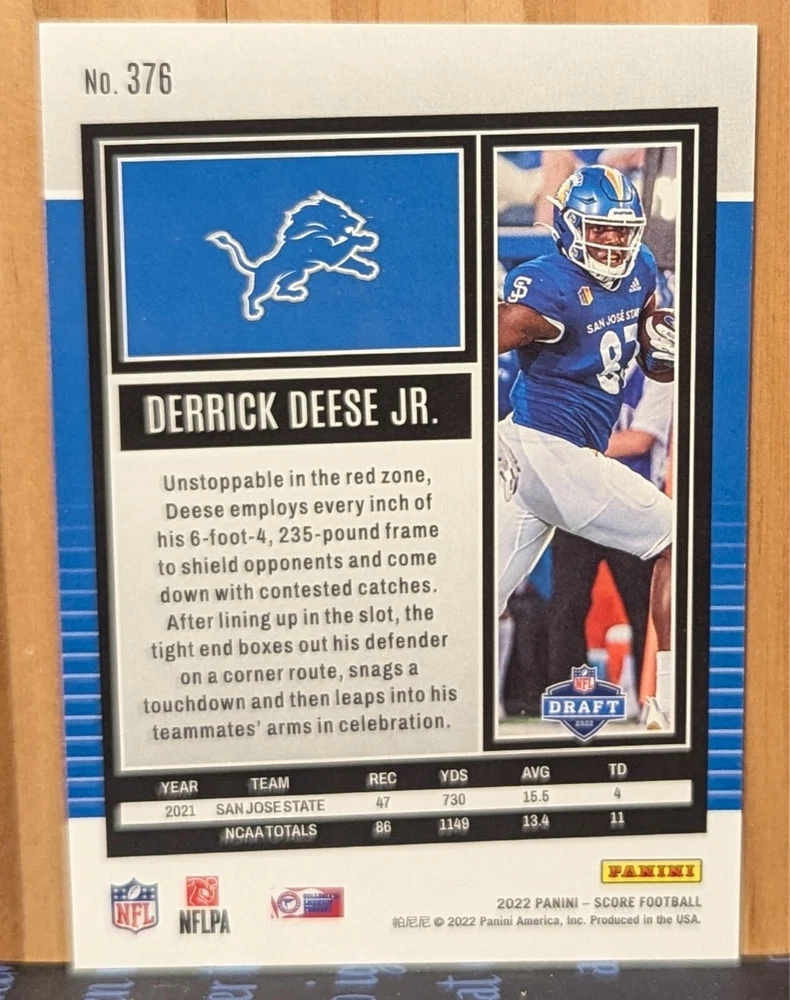 This 2022 Panini Score card features Derrick Deese Jr., a former player for the Detroit Lions. The card is a part of the base set and is considered a rookie card. It has a card number of 376 and is an original, not a licensed reprint. The card is in standard size and is a part of the National Football League (NFL) league. It is a sports trading card and is manufactured by Panini in the United States. The card is RAW, but will ship in a penny sleeve and top loader to maintain its existing condition.