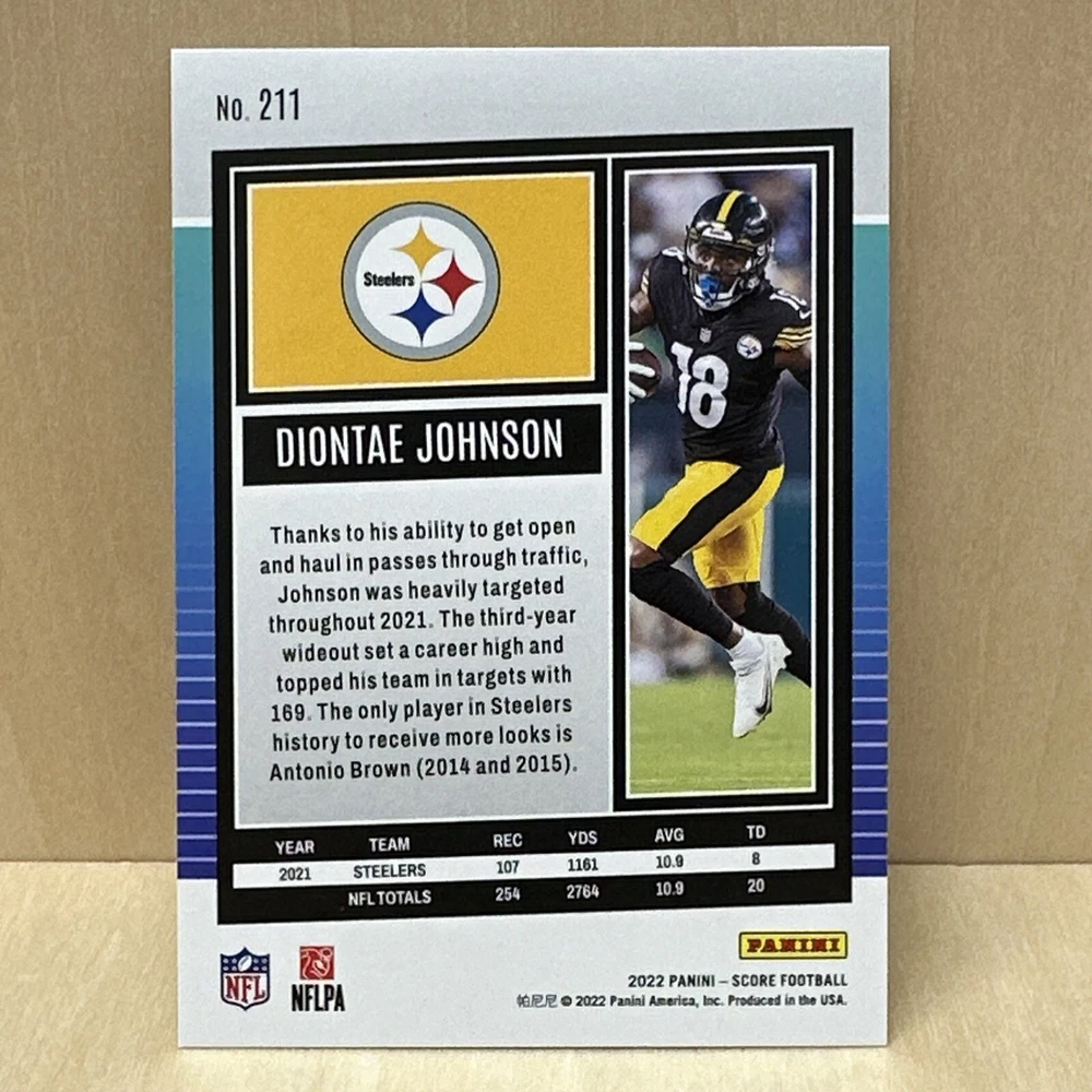Set: 2022 Score Original/Licensed Reprint: Original Card Number: 211 Features: Parallel/Variety Vintage: No Country/Region of Manufacture: United States Card Size: Standard Sport: Football Material: Card Stock Type: Sports Trading Card Parallel/Variety: Gold League: National Football League (NFL) Language: English Autographed: No Manufacturer: Panini Team: Pittsburgh Steelers Year Manufactured: 2022 Season: 2022 Player/Athlete: Diontae Johnson