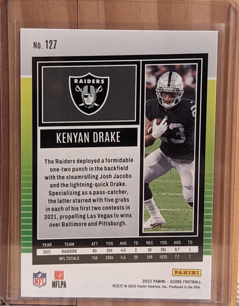 This 2022 Panini Score card features Kenyan Drake formerly for the National Football League's Las Vegas Raiders, and most recently with the Green Bay Packers. It is part of the base set and has the card number 127. The card is standard-sized and was manufactured in 2022, making it a great addition to any football fan's collection. The card is RAW, but will ship in a penny sleeve and top loader to maintain it's existing condition. The card is perfect for fans of Kenyan Drake and the Las Vegas Raiders or the Green Bay Packers, as well as collectors of sports trading cards.