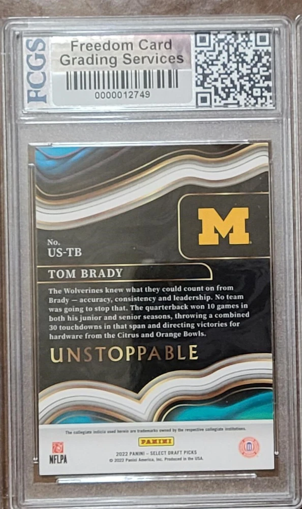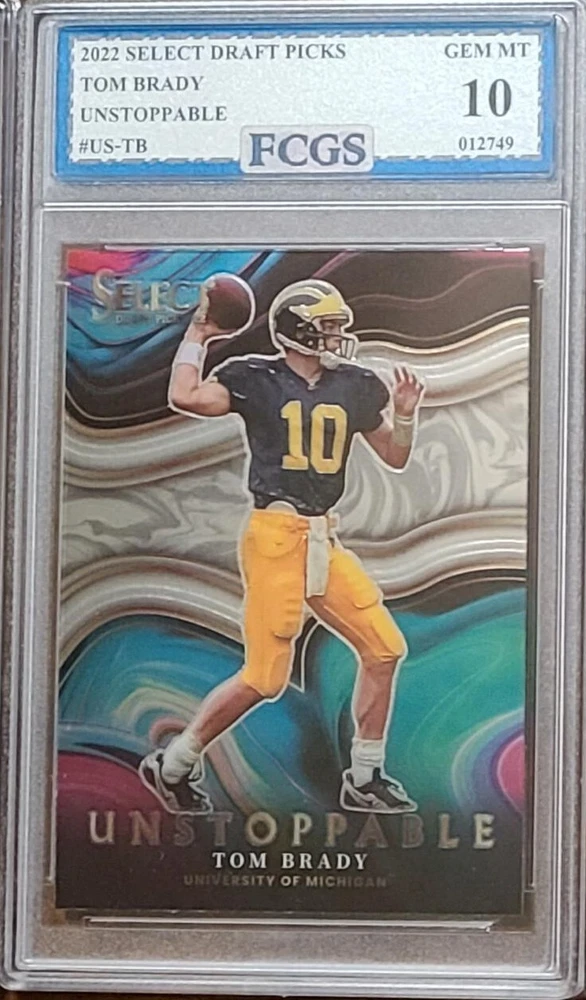 Elevate your sports card collection with the 2022 Panini Select Draft Picks - Unstoppable #US-TB featuring the legendary Tom Brady. Representing his time with the Michigan Wolverines, this card is a must-have for fans and collectors alike. The card boasts an eye-catching design, highlighting Brady's prowess on the field and his impact on the sport of football. This card comes from the sought-after Unstoppable insert set, part of the Panini Select Draft Picks series. It's a standout piece manufactured by Panini, a trusted name in sports memorabilia. The card is ungraded, providing you with the opportunity to have it professionally graded to your satisfaction. Add this gem to your collection and celebrate the career of one of football's greats.