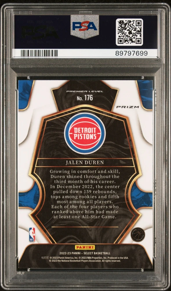 You are purchasing a 2022 Panini Select Jalen Duren #176 Red Cracked Ice PSA 10. You will receive the exact item in the photographs. Thank you for looking. Listed With Mascot .