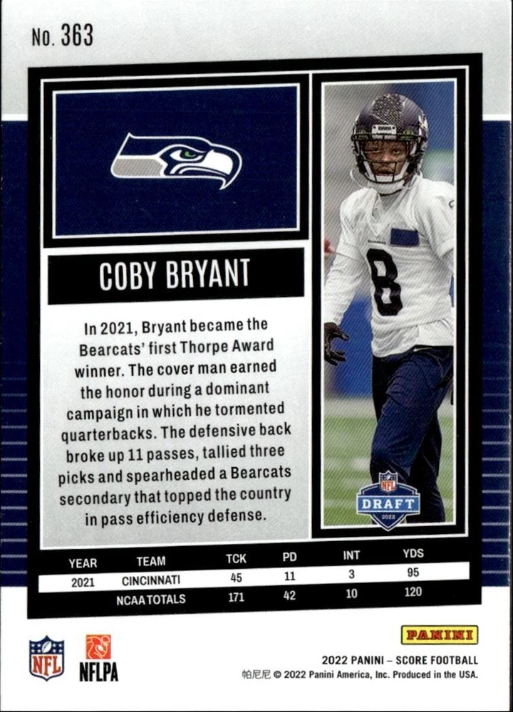 About Me Other Listings Feedback Add to Favorites Contact Me eBay Store JEm_Mint_Trading 2022 Score Rookie Coby Bryant Rookie Seattle Seahawks #363 No stock photo / These are real scans or pictures Details Description: Coby Bryant Category: Football Year: 2022 Product: Score Rookie Team: Seattle Seahawks Card Number: 363 Rookie: Yes Dimensions: 3½" x 2¼" SKU: FT A0007 R01 J (4) Listing By Kronocard trading cards software v2.8.1.2
