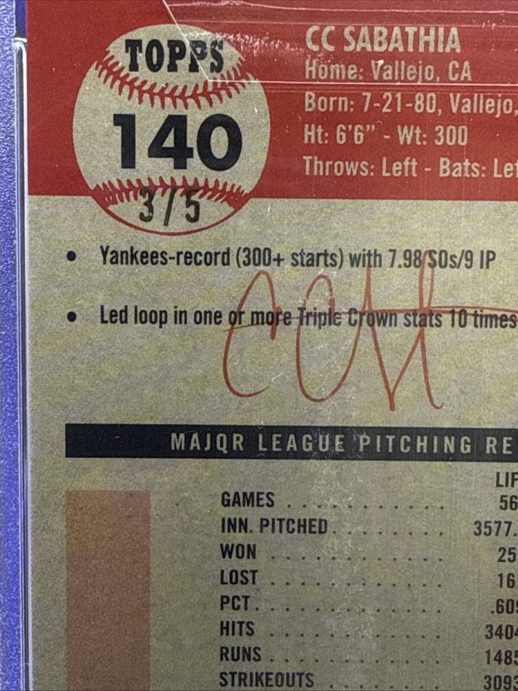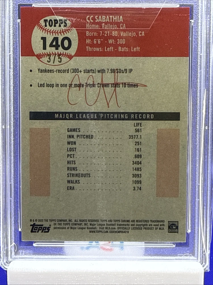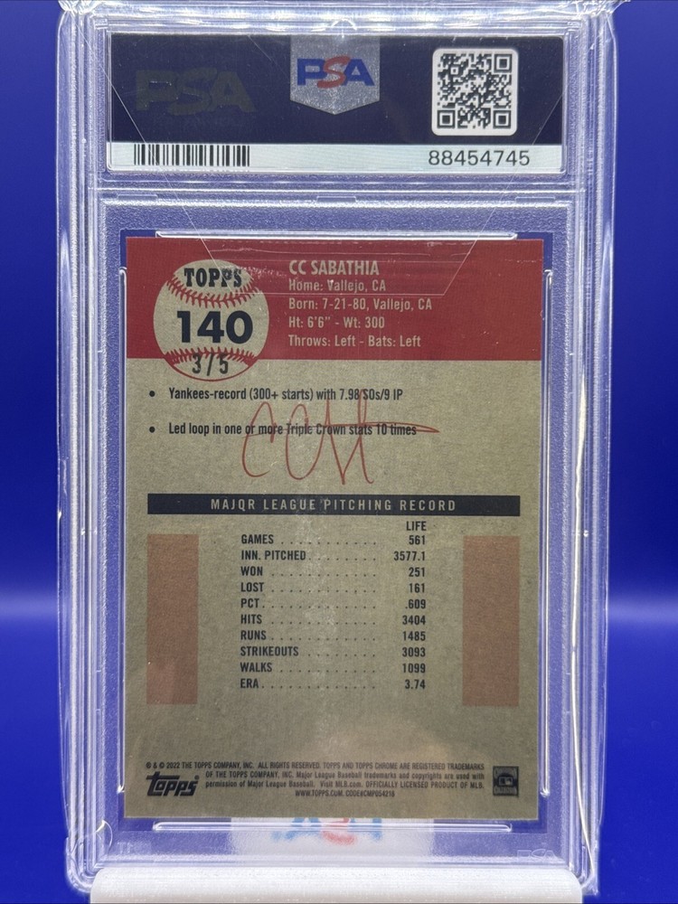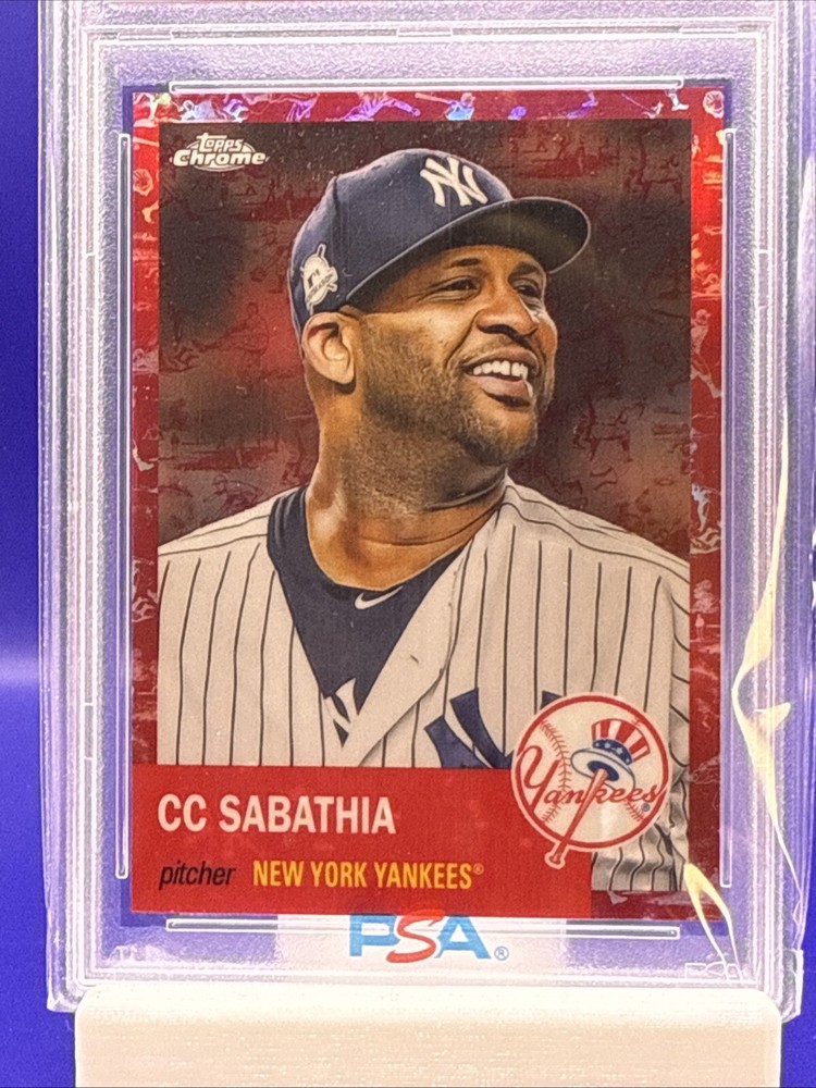 This is a 2022 Topps Chrome Platinum Anniversary trading card featuring CC Sabathia of the New York Yankees. The card is a Platinum Toile Cream And Red Refractor parallel, with a print run of 5. It is serial numbered 3/5, PSA graded 9, and is a 2025 Hall of Fame inductee collectible. The card is made of 55 Pt. card stock and was manufactured in the United States by Topps.