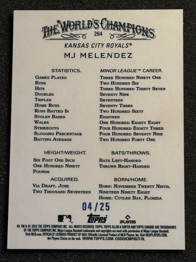 Type:Sports Trading CardSet:2022 Topps Allen & Ginter ChromeParallel/Variety:Green RefractorSport:BaseballCard Number:264Manufacturer:ToppsFeatures:Rookie, Serial Numbered, Base Set, Parallel/VarietyTeam:Kansas City RoyalsPlayer/Athlete:MJ MelendezSeason:2022Print Run:99League:Major League Baseball (MLB)