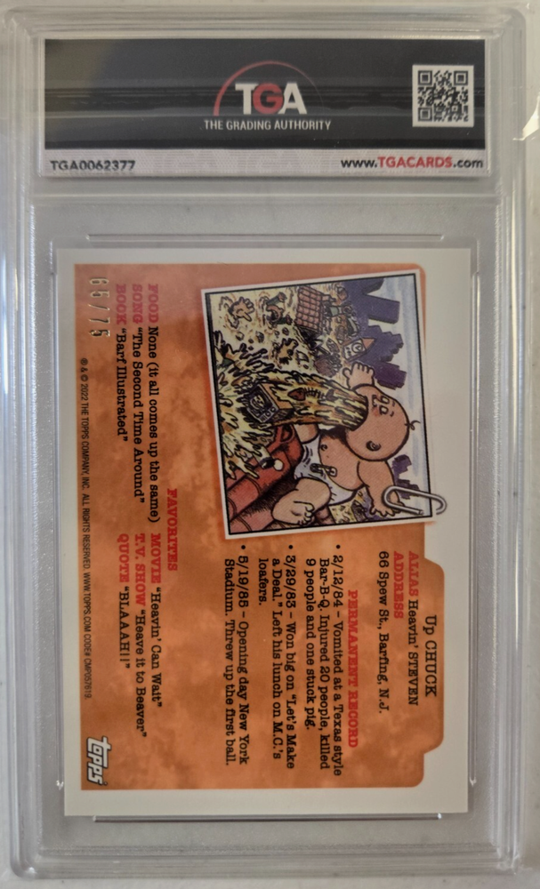 2022 Topps Chrome Garbage Pail Kids - Juicy Lucy. The Card is a Special Orange Refractor, Serialized 65/75, and is Graded Mint 9 by TGA.