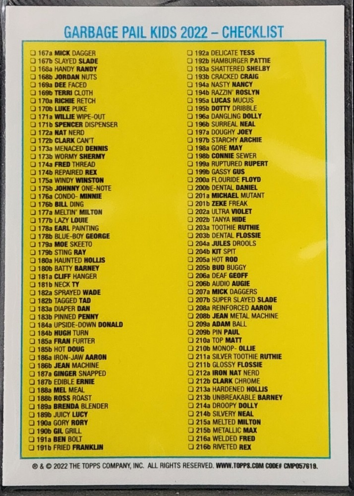 Dive into the irreverent world of Garbage Pail Kids with the 2022 Topps Chrome Series 5 Kit Spit 204b Refractor card. This card, a gleaming addition to any collection, features the beloved character Kit Spit in all his eccentric glory. With its sleek refractor finish, it's designed to stand out, making it a must-have for fans and collectors alike. Crafted with the quality you expect from Topps Chrome, this trading card is an original piece from the 2022 series, ensuring authenticity and collectible value. At the standard 3½" x 2½" size, it fits perfectly into any card protector or display. Whether for play or collection, this Garbage Pail Kid is ready to shine among your most treasured trading cards. Welcome to Card Crack Chronicles! Shipping Details Within Canada: All cards are shipped in a penny sleeve and toploader for maximum protection. To the USA: Cards are shipped in a penny sleeve only (no toploader due to customs regulations), but rest assured, they'll have extra protection. Important: You will receive the exact card pictured in the listing. Shipping Methods: Canada: Lettermail: $2.99 for the first item, plus $0.25 for each additional card in this listing. Expedited (with tracking): $7.99 for the first item, plus $0.25 for each additional card in this listing. United States: Standard Shipping: $4.99 for the first item, plus $0.25 for each additional card in this listing. Tracked Lettermail: $11.99 for the first item, plus $0.25 for each additional card in this listing. Local Pickup: Available for buyers in or around the Hamilton, Ontario area. Additional Information: Items will be shipped via Canada Post within two business days after receiving cleared payment. Please make your payment within two days of purchase. Stock updates happen often, so be sure to watch this listing for your future needs. Don?t forget to check out our other listings?new items are added daily! Thank you for choosing Card Crack Chronicles!