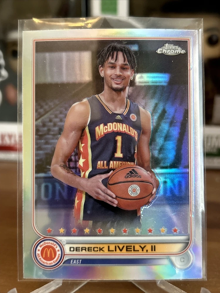 Be sure to see these pulled pack fresh on YouTube @bluecollarbreaks. make sure to like and subscribe. This is a rare and highly sought-after sports trading card featuring Dereck Lively, II, from The Westtown School Moose. The card is from the 2022 Topps Chrome McDonald's All American set and is a limited edition, exclusive collectors item. It is a 1st Edition memorabilia card with the card number 2 and is perfect for any NBA or National Collegiate Athletic Association (NCAA) fan. The card is ungraded, but the quality of the card is near mint or better. It is manufactured by Topps and is a part of the 2022 season. This card is a great addition to any sports trading card collection and is sure to impress.
