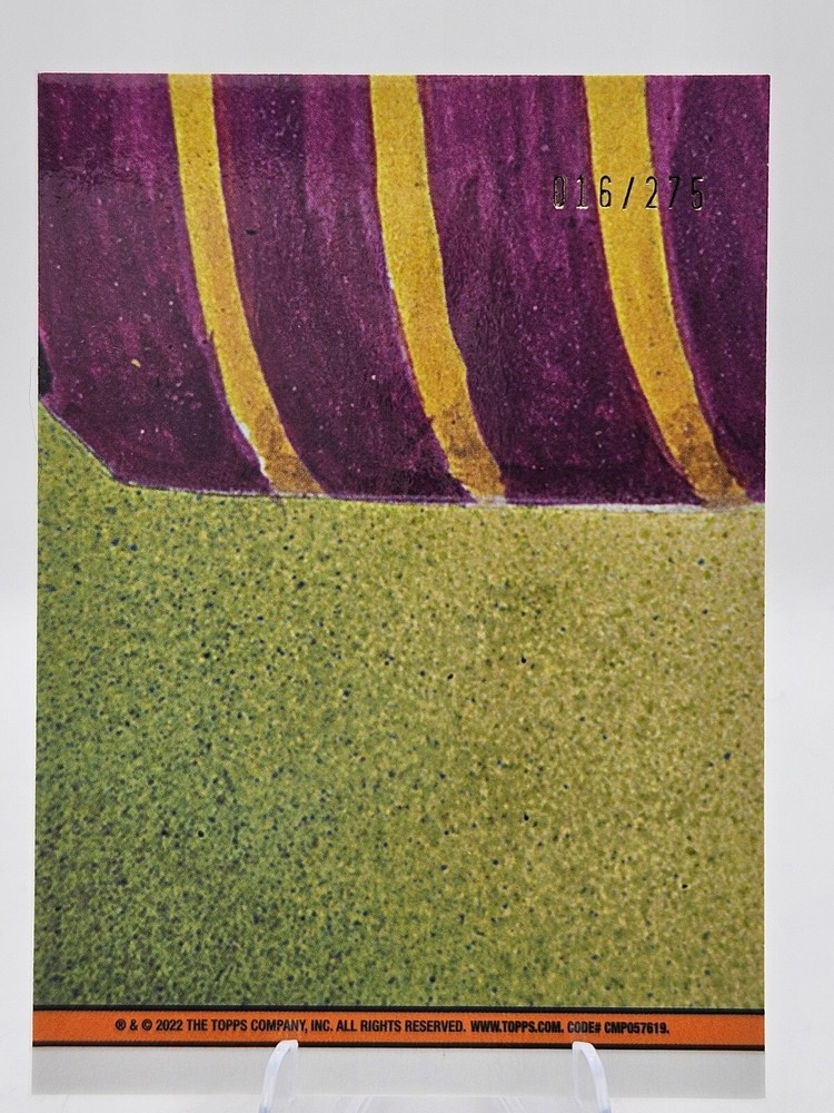 This is a rare 2022 Topps Garbage Pail Kids Chrome trading card featuring Iron-Jaw AARON. The card is a Non-Sport Trading Card with a Yellow Refractor parallel/variety and a card number of 186a. It is manufactured by Topps and is part of the Garbage Pail Kids franchise. The card is from the 2022 Topps Garbage Pail Kids Chrome set. This collectible item is perfect for fans of Iron-Jaw AARON and collectors of Non-Sport Trading Cards.