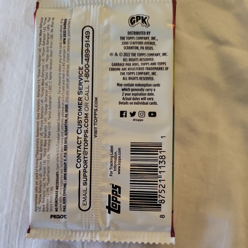 1. This pack is a blast of nostalgia with a fresh chrome twist! The vibrant colors and sharp details make these GPK cards pop, and the mix of base cards, short prints, and parallels keeps opening packs exciting. Perfect for collectors who love the classic 1986 series—every pack feels like a fun surprise. The quality is solid, and the humor is as wild as ever. Highly recommend for fans and new collectors alike!