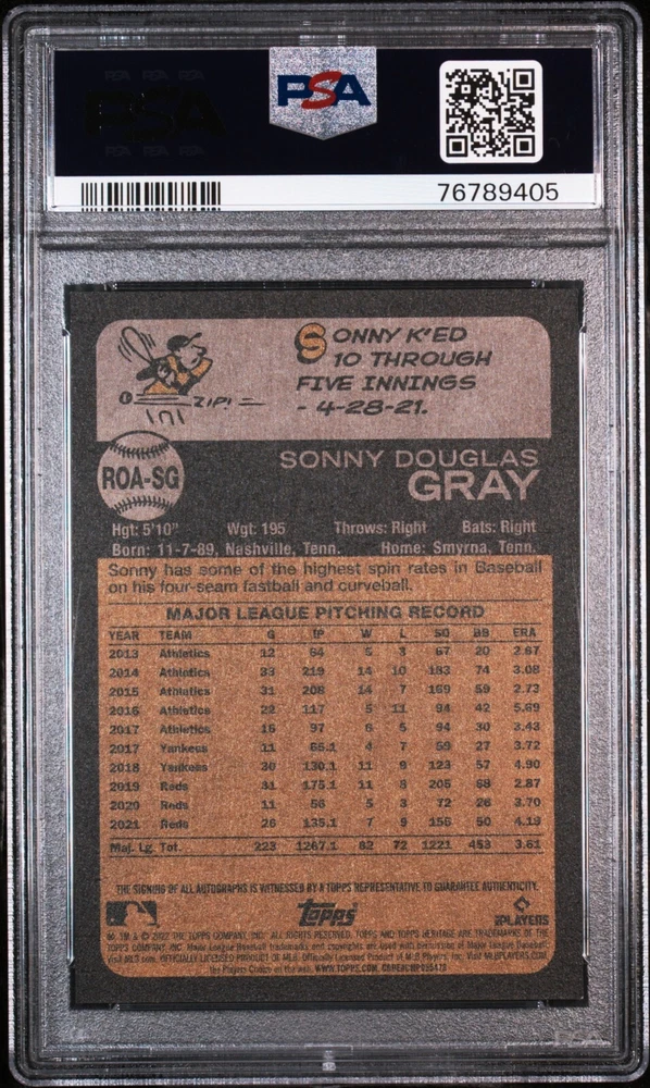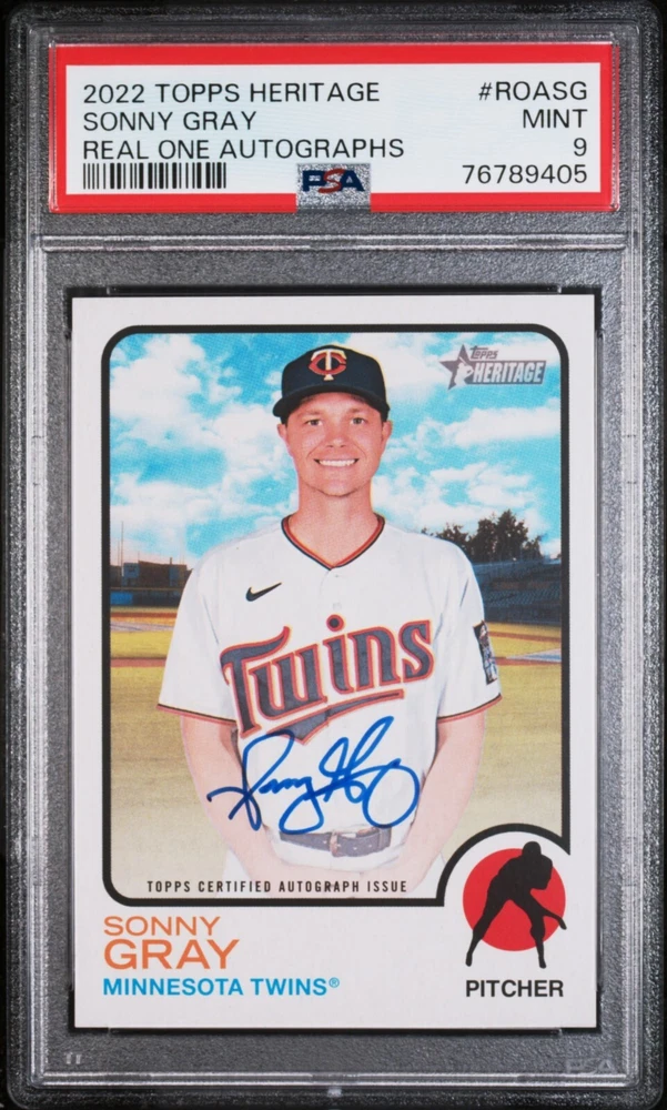 The product is a 2022 Topps Heritage Real One Autograph card of Sonny Gray, signed by the player with blue ink. The card features an authenticated autograph of Sonny Gray, a pitcher who has played for teams like the Minnesota Twins and St. Louis Cardinals during the 2021 season. This MLB trading card is part of the Real One Autographs insert set by Topps, manufactured on card stock in the standard size. It is an original licensed reprint with a hard-signed autograph, making it a valuable addition for baseball card collectors.