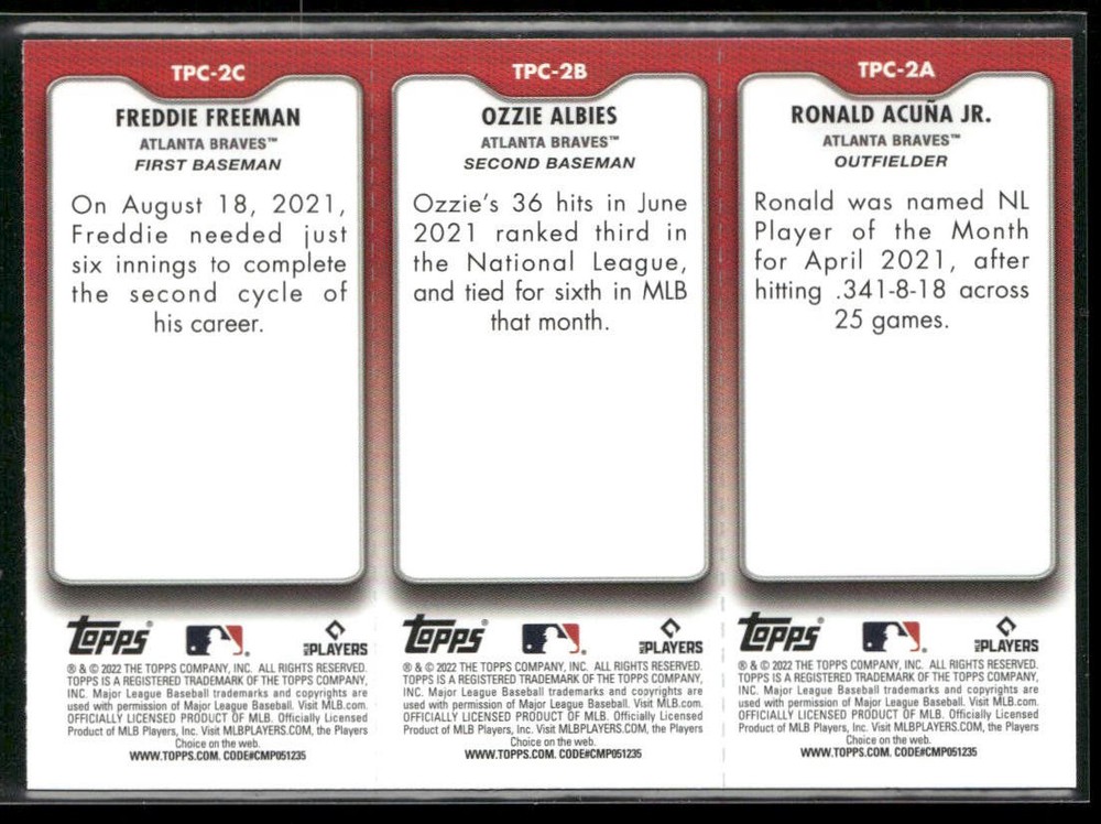 โพ Baseball Card featuring 2022 Topps Opening Day #TPC-2A / TPC-2B / TPC-2C Ronald Acuna Jr. / Ozzie Albies / Freddie Freeman - Atlanta Braves . โพ ๐ฅ Product Details: Set: 2022 Topps Opening Day Player: Ronald Acuna Jr. / Ozzie Albies / Freddie Freeman Card Number: #TPC-2A / TPC-2B / TPC-2C Team: Atlanta Braves ๐ Key Features: Authentic baseball base card from the 2022 Topps Opening Day series. Dynamic image capturing Ronald Acuna Jr. / Ozzie Albies / Freddie Freeman in action for Atlanta Braves. Essential for any baseball card collection. ๐ก Why You'll Love It: Celebrate your favorite player and team. A foundational piece for baseball card enthusiasts. Quality craftsmanship and officially licensed. ๐ Explore my other Buy Now listings for more baseball base cards and collectibles! Please note that this advertisement is tailored for platforms such as eBay and is aimed at showcasing the key aspects of the sports card. The images included are of the actual card in question. We encourage you to closely examine these images for a detailed overview, including any blemishes or imperfections on the card. Your careful inspection will ensure a thorough understanding of the card's condition.