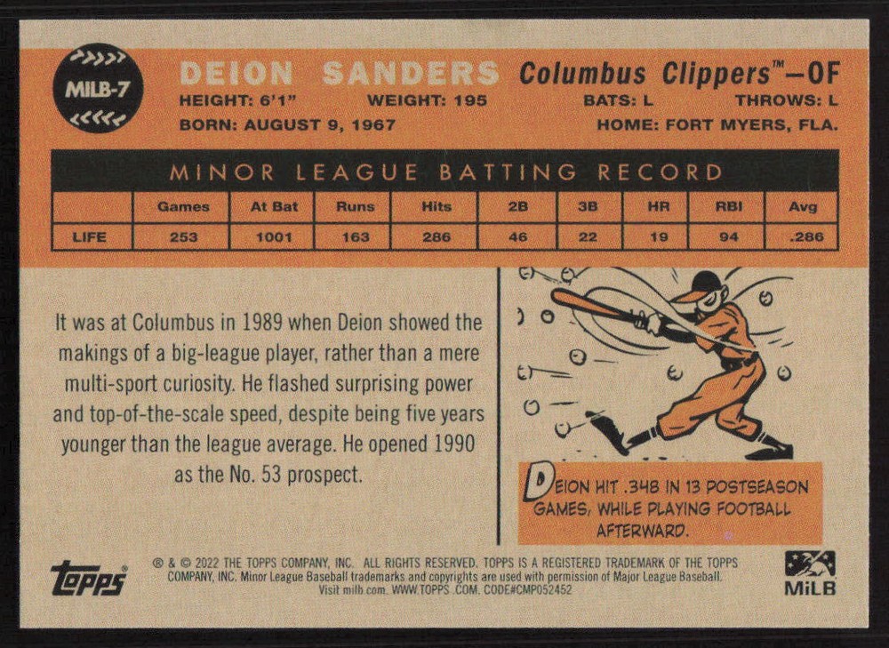 This is a nice example of a 2022 Topps Pro Debut #MILB-7 Deion Sanders MiLB Legends Other important information about this card: In 2022 Deion Sanders played for the Columbus Clippers. Please check out our other listings for more great cards.