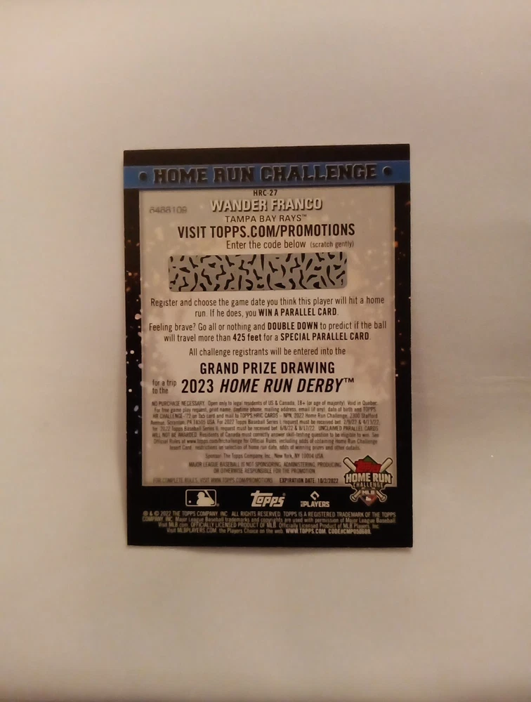 This 2022 Topps Series 1 trading card features Wander Franco, a rookie player for the Tampa Bay Rays in Major League Baseball (MLB). The card is part of the Home Run Challenge Code Card insert set and has the card number HRC-27. It is a sports trading card manufactured by Topps for the 2022 season. The card is a great addition to any collection for fans of baseball and collectors of trading cards. It showcases Franco's skills and potential as a player for the Tampa Bay Rays. The card is perfect for those who appreciate rookie cards, insert cards, and cards from the 2022 Topps Series 1 set.