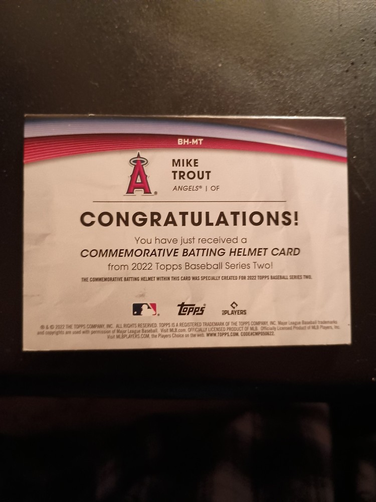 Parallel/Variety: [Base] Type: Sports Trading Card Player/Athlete: Mike Trout Card Number: BH-MT Features: Insert League: Major League Baseball (MLB) Team: Los Angeles Angels Set: 2022 Topps Series 2 Season: 2022 Manufacturer: Topps Sport: Baseball Insert Set: Batting Helmet Commemorative Relics