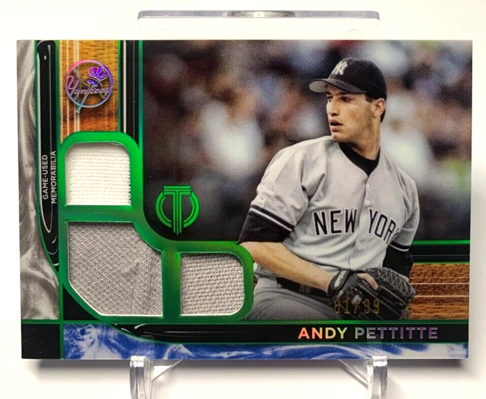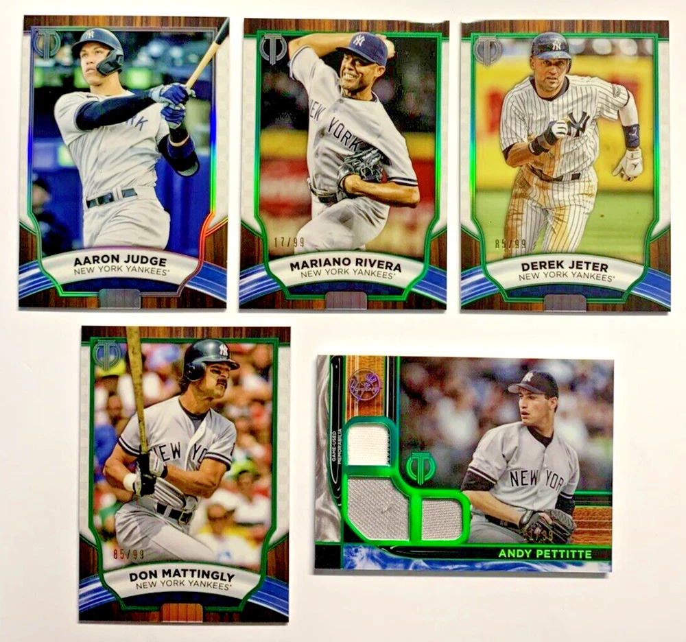 Seller Notes: “All Near Mint or Better” Language: English Card Number: 15, 85, TTR-AP, 32, 53 Season: 2022 Sport: Baseball Original/Licensed Reprint: Original League: Major League (MLB) Autographed: No Manufacturer: Topps Type: Sports Trading Card Material: Card Stock Features: Base Set, Insert, Parallel, Serial Numbered, Memorabilia Vintage: No Player/Athlete: Andy Pettitte, Derek Jeter, Don Mattingly, Mariano Rivera, Aaron Judge Set: 2022 Topps Tribute Card Size: Standard Card Name: 2022 Topps Tribute #53 Aaron Judge, 2022 Topps Tribute Green #85 Don Mattingly /99, 2022 Topps Tribute Green #32 Mariano Rivera /99, 2022 Topps Tribute Green #15 Derek Jeter /99, 2022 Topps Tribute Green Triple Relic #TTR-AP Andy Pettitte /99 Year Manufactured: 2022 Number of Cards: 5 Team: New York Yankees