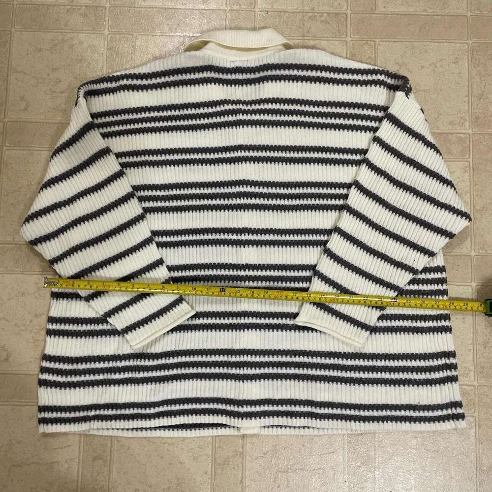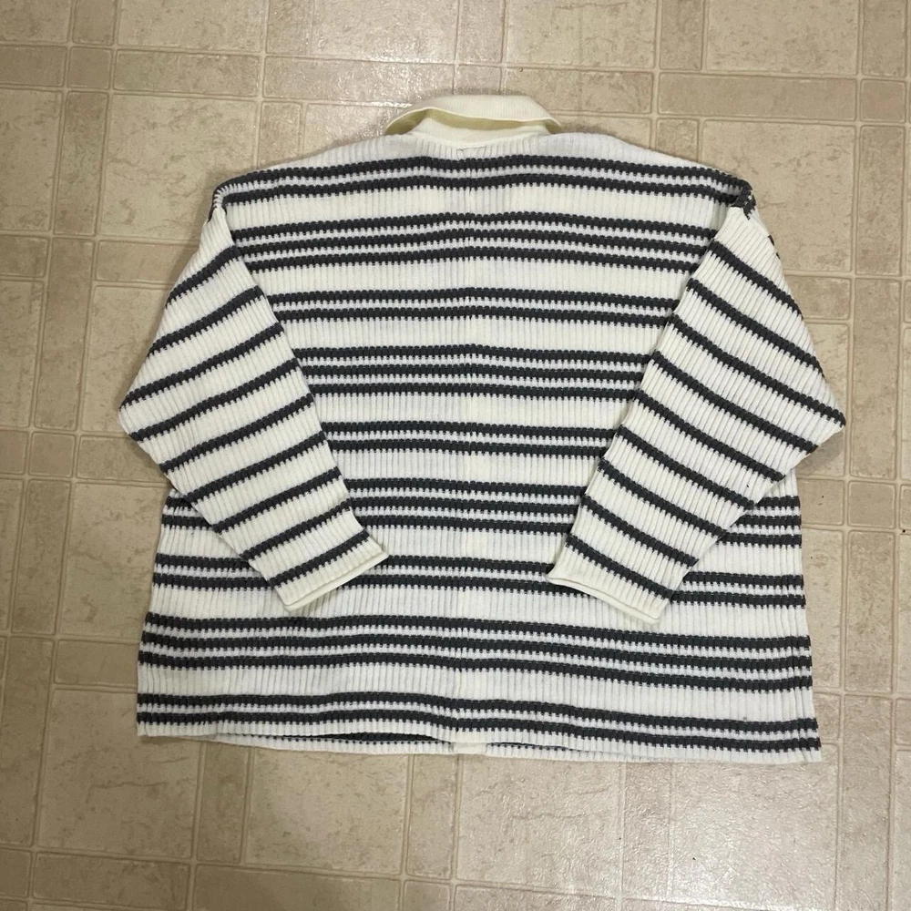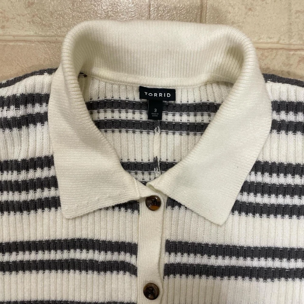 Stay cozy and stylish with this 2022 Torrid Women's 3X Grey White Striped Pullover Collared Button Front Sweater. This knit sweater features a classic striped pattern in grey and white, with a collared neckline and 3/4 sleeves. The pullover style makes it easy to wear, while the button accents add a touch of elegance. Perfect for any occasion, this sweater is a must-have for any fashion-forward woman's wardrobe. Whether you're dressing up for a night out or keeping it casual with jeans and a t-shirt, this sweater is sure to make you look and feel great. Don't miss out on this stylish and comfortable addition to your collection.