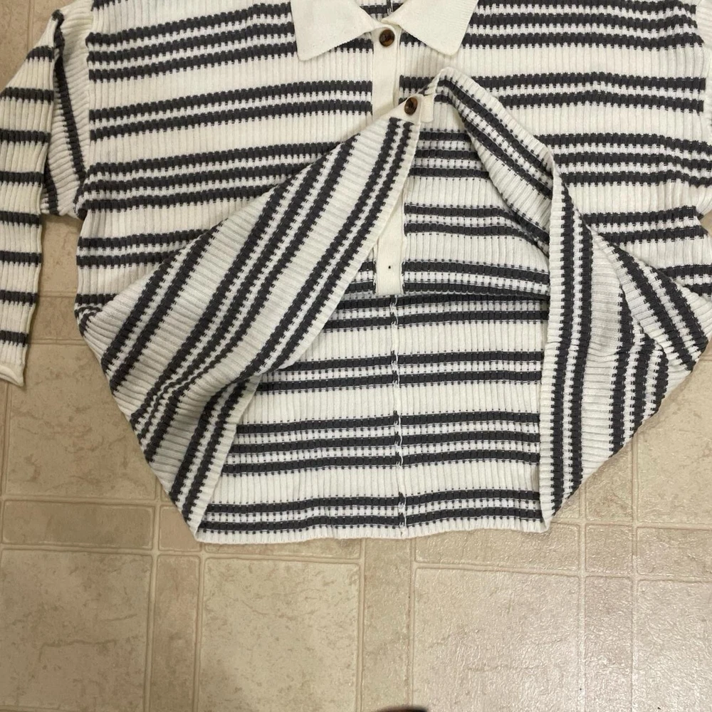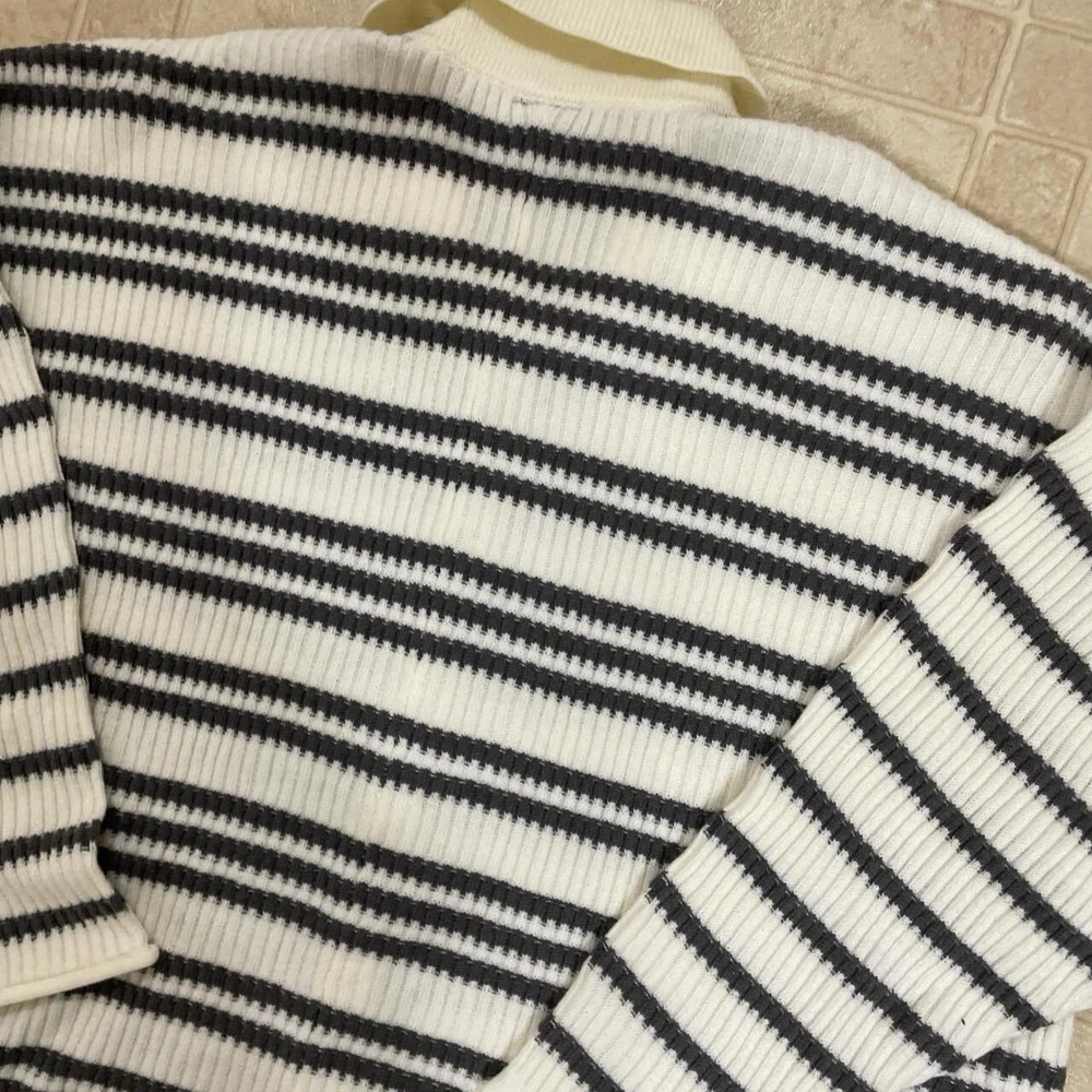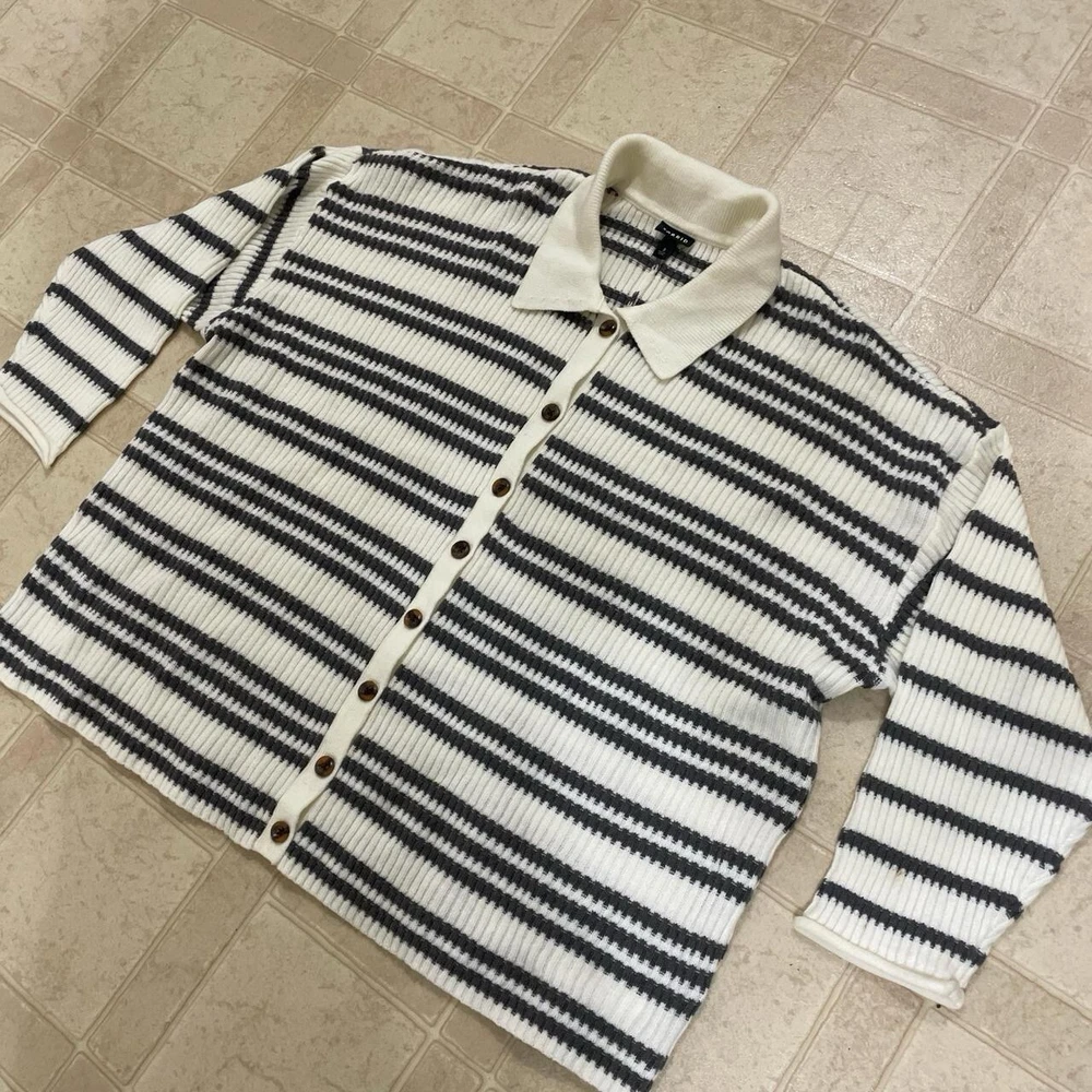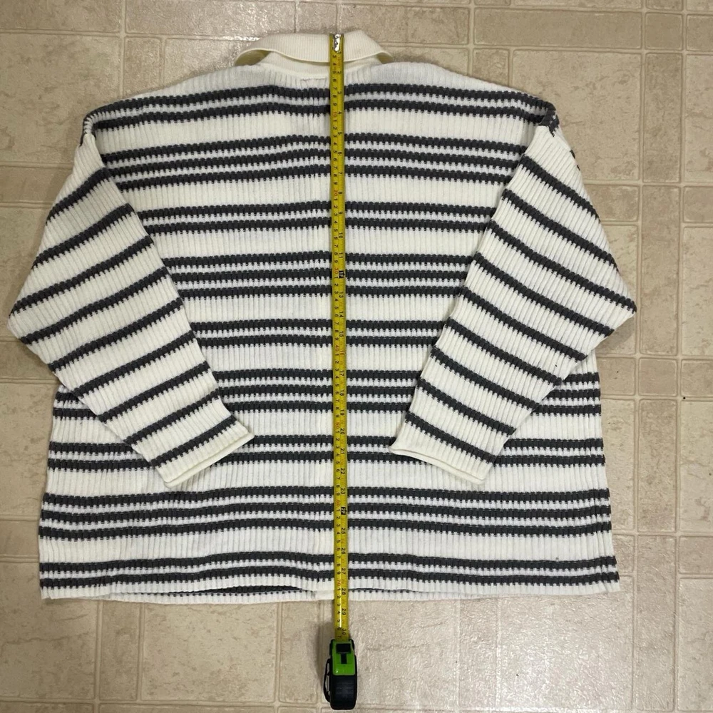 Stay cozy and stylish with this 2022 Torrid Women's 3X Grey White Striped Pullover Collared Button Front Sweater. This knit sweater features a classic striped pattern in grey and white, with a collared neckline and 3/4 sleeves. The pullover style makes it easy to wear, while the button accents add a touch of elegance. Perfect for any occasion, this sweater is a must-have for any fashion-forward woman's wardrobe. Whether you're dressing up for a night out or keeping it casual with jeans and a t-shirt, this sweater is sure to make you look and feel great. Don't miss out on this stylish and comfortable addition to your collection.