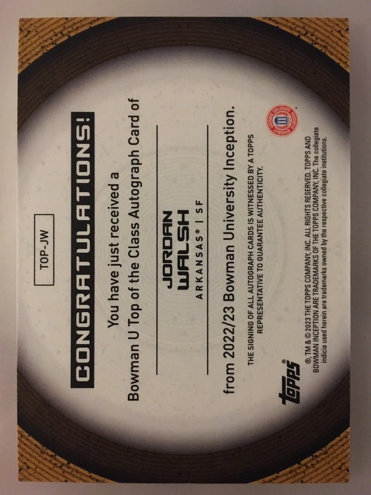 This rare and highly sought-after sports trading card features Jordan Walsh, a talented player from the Arkansas Razorbacks and Boston Celtics teams. The card is an excellent state from the 2022 Bowman University set, with a print run of only 100. It is a parallel/variety card with the Inception design, and is serial numbered as 079/100. The card is autographed by Jordan Walsh himself, making it a valuable addition to any collection. This card is a must-have for any basketball fan and collector, and is sure to impress.