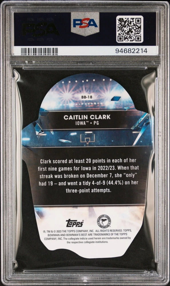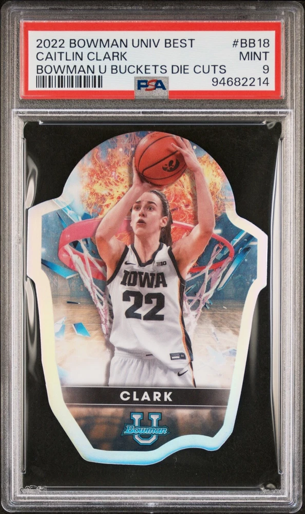 Elevate your collection with the 2022-23 Bowman University Best Caitlin Clark Buckets Die-Cut card #BB-18. Featuring the Iowa Hawkeyes' standout player, this trading card is a must-have for basketball enthusiasts and collectors alike. The die-cut design adds an artistic touch, showcasing Clark's prowess on the court during her rookie season.Certified by PSA with a grade of 9, this card boasts a pristine quality. The Bowman U Buckets Die-Cut insert set captures the essence of collegiate basketball, making it a prized possession for any fan of the sport. The card is a testament to Caitlin Clark's promising career with the NCAA's Iowa Hawkeyes.