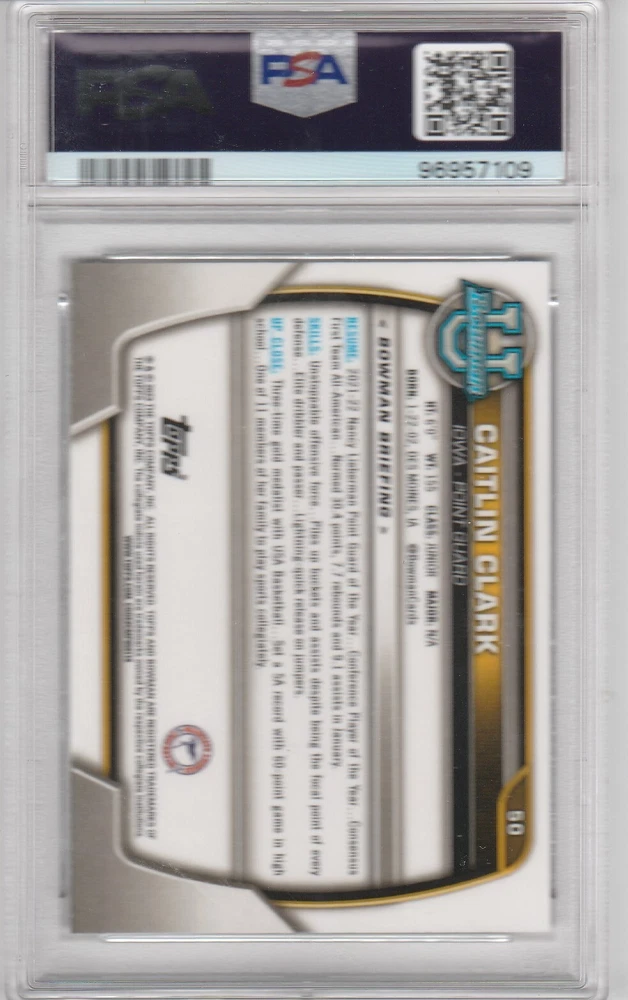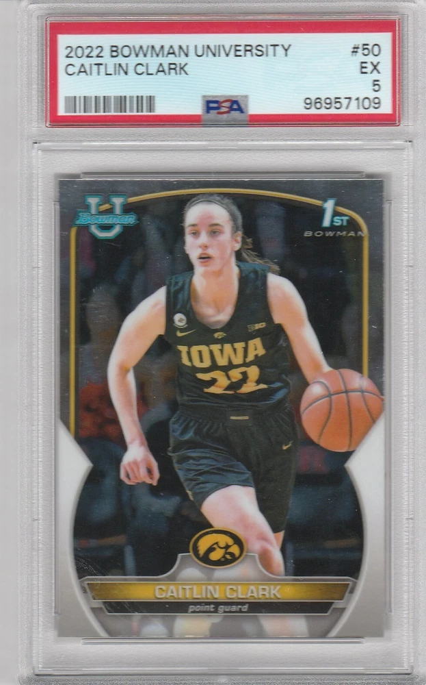 brand:ToppsSet:2022-23 Bowman University ChromePlayer/Athlete:Caitlin ClarkSeason:2022-23Sport:BasketballTeam:Iowa HawkeyesLeague:National Collegiate Athletic Association (NCAA)Card Number:50Manufacturer:ToppsSeries:Bowman University ChromeFeatures:Base Set, Rookie