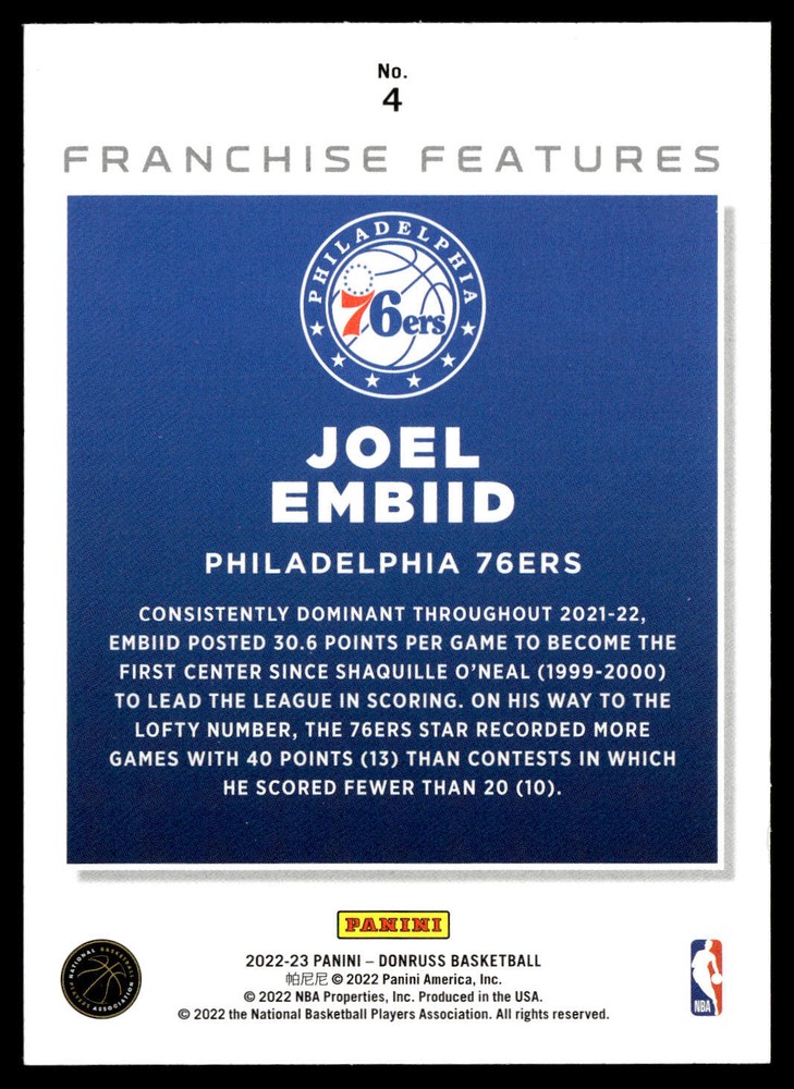 The Card pictured is the card you will receive unless there are multiple quantities then you will receive a card in the comparable grade. Cards in poor condition could have creasing, stains, rounded corners, pen marks or a combo of them. please see pics for a better understanding of cards condition. Excellent Philadelphia 76ers Franchise Features Joel Embiid #4 2022-23 Donruss Donruss 2022 Basketball .