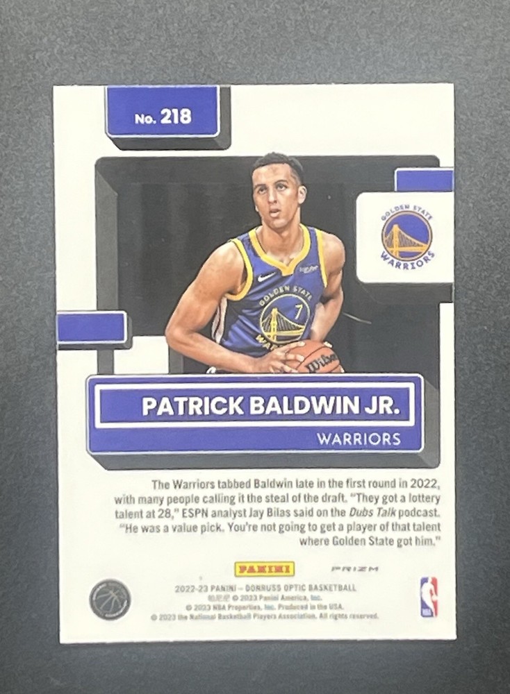 Enhance your sports card collection with the 2022-23 Panini Donruss Optic Basketball Patrick Baldwin Jr. Rated Rookie holo green hyper prizm short printCard. This striking card features the talented basketball player in his Golden State Warriors, Sacramento Kings, and Washington Wizards tenure, capturing the essence of his dynamic presence on the court. The Green Hyper Prizm parallel variety adds an eye-catching shimmer, making it a standout piece. Recently traded to Sacramento Kings at 2024 NBA trade deadline Card number 218 is a testament to Baldwin's promising career, commemorated in this standard-sized, card stock trading card. As a non-autographed, original piece from the United States, it's a perfect addition for both dedicated fans of the NBA and collectors of sports memorabilia. With its hologram feature and short print run, it's sure to be a prized possession that celebrates Baldwin's ascent in the basketball world. Receive card shown encased in clear plastic sleeve plus top loader review images to confirm condition and description