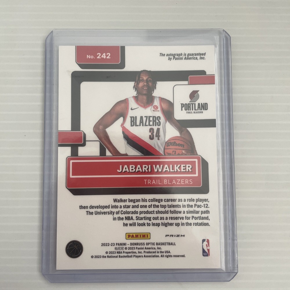 This 2022-23 Panini Donruss Optic Choice Prizm Signatures card features Jabari Walker, a rookie player from the Portland Trail Blazers. The card is a single-parallel product and has a card number of 242. It is an original and not a reprint. The card is rated as Near mint or better and is ungraded. It is manufactured by Panini America, Inc. and is a sports trading card for basketball enthusiasts. This card is a great addition to any collection and is a must-have for fans of Jabari Walker and the Portland Trail Blazers.