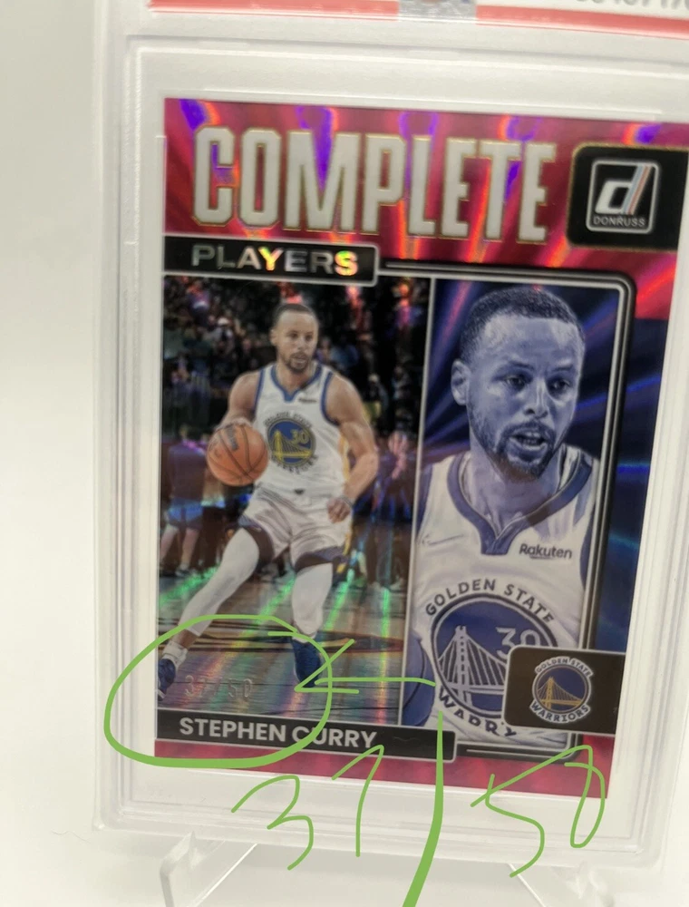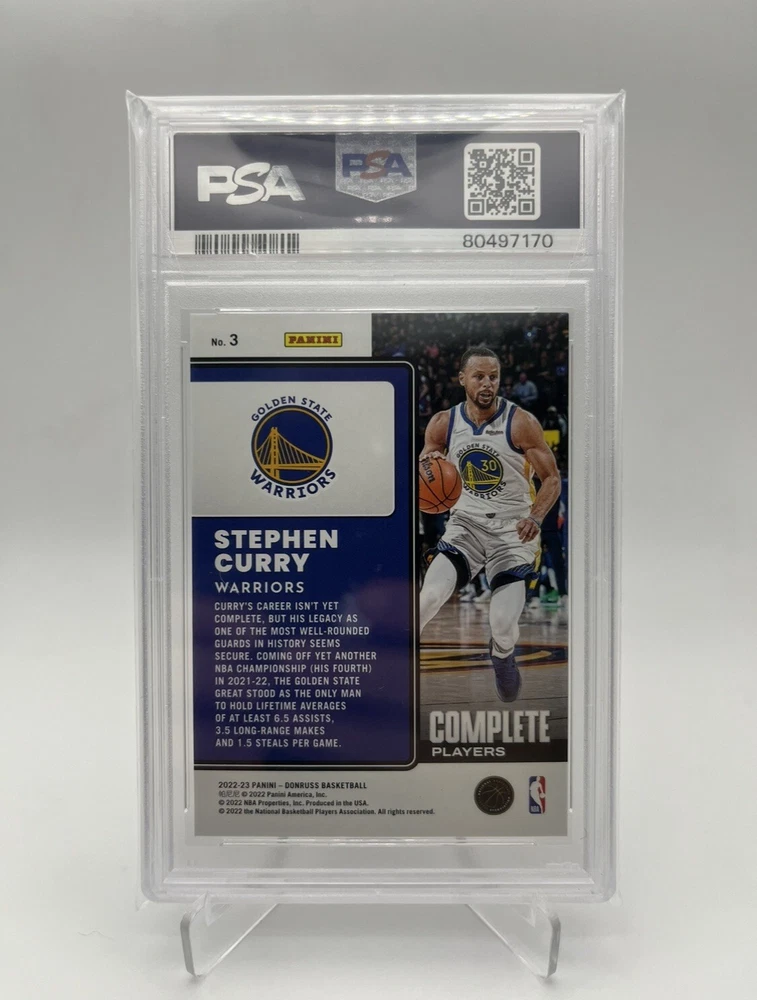 Elevate your basketball trading card collection with this Stephen Curry 2022-23 Donruss Complete Players #3 Warriors PSA 9. Featuring a stunning image of the NBA superstar, this card showcases his talents in the court and is a must-have for any basketball fan or collector. Crafted by Donruss, a renowned sports trading card manufacturer, this card comes with exciting features like an insert and a complete player's parallel/variety. Whether you're a Warriors fan or a Curry enthusiast, this card is a valuable addition to your collection. Get your hands on this 2022 card today and take a piece of the game with you! Free shipping Item 456