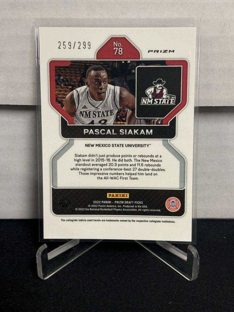 Type: Sports Trading Card Card Number: 78 Team: New Mexico State Aggies, Toronto Raptors Card Size: Standard Features: Parallel/Variety, Serial Numbered, Short Print, Base Set Autographed: No League: National Basketball Association (NBA), National Collegiate Athletic Association (NCAA) Parallel/Variety: Red Prizm Sport: Basketball Set: 2022 Panini Prizm Season: 2022-23 Print Run: 299 Manufacturer: Panini Player/Athlete: Pascal Siakam