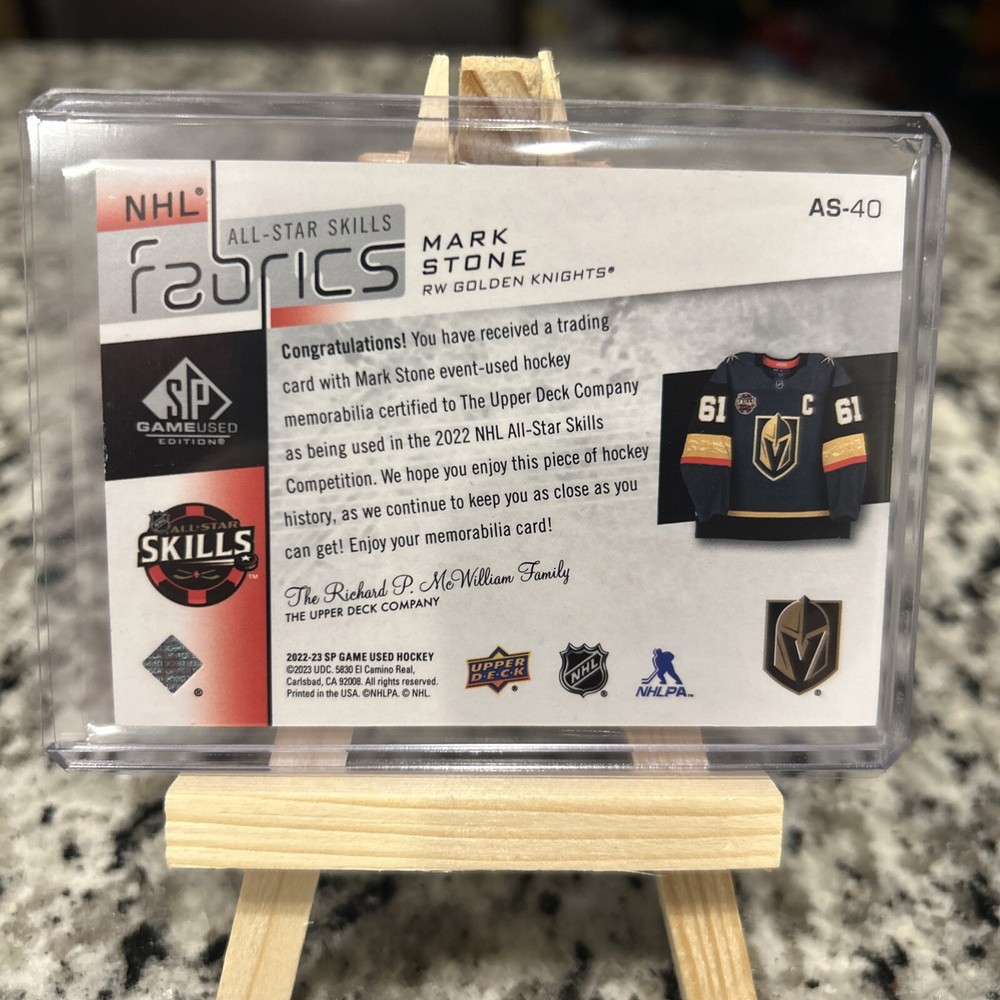 This is a 2022-23 SP Game Used All-Star Skills Fabric Jersey Swatch card featuring Mark Stone of the Vegas Golden Knights. The card is a memorabilia card that includes a piece of his jersey from an All-Star Game. It is a short print card, making it a rare find for collectors. The card is in near mint or better condition and is part of the Upper Deck set for the 2022-23 NHL season.