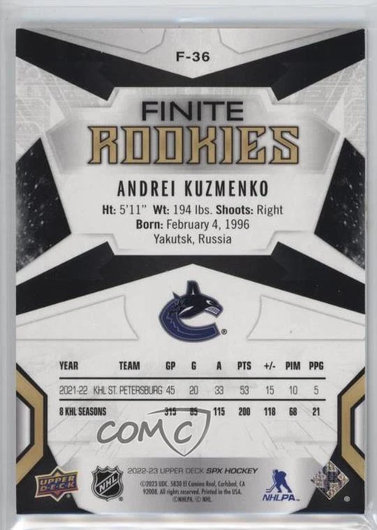 2022-23 SPx - Finite Rookies - Green #F-36 Andrei Kuzmenko Qty Made: 199 - Rookie - Ice Hockey Card - Featuring the Vancouver Canucks - Featuring Andrei Kuzmenko Search for more: 2022-23 SPx Search for more: 2022-23 SPx - Finite Rookies - Green View all of our Listings Auctions Buy It Now About Us Located in the beautiful Pacific Northwest, COMC (Check Out My Cards) is the world's largest consignment service for trading card singles. More than 10,000 people have used our consignment service to list over 50 million trading cards. We currently house 20 million cards, each listed for sale with front and back images of the actual card. Find out how we can help you consign your items on eBay by contacting us through eBay messaging. COMC -- "The Safe & Easy Way to Buy & Sell" Representative Image - Select Specific Item above to see image of actual item Representative Image - Select Specific Item above to see image of actual item Raw Condition for Modern Cards Unless otherwise noted, raw modern cards are listed in Near Mint-Mint condition or better. A NM-MT card appears to be Mint at first glance, but upon closer inspection, may exhibit some of the following: minor print defects (e.g. roller marks, print line, dimple), minor scratches, slight edge wear, and slight corner wear. Centering is clearly visible in the images provided and does not factor into our condition assessment. Raw Condition for Vintage Cards Unless otherwise noted, raw vintage cards are listed in Excellent condition or better. An EX card may exhibit some of the following: minor rounding of corners, surface wear, print defects, light scratches, and slight edge wear/chipping. Centering is clearly visible in the images provided and does not factor into our condition assessment. Domestic Shipping Combined shipping for multiple items is available. To receive combined shipping, please ensure all desired items are in your eBay shopping cart before proceeding to checkout. eBay limits orders to 40 items per order. We automatically combine multiple orders placed on the same day. If you place multiple orders on the same day, please contact us to request a refund of applicable shipping costs. Signature confirmation may be required on invoices over $400. Raw cards are shipped in toploaders. International Shipping COMC offers eBay's International Shipping (EIS) for international orders under $2,500* (see country exceptions below). All duties and import fees are paid at checkout; in the rare event that there are additional import fees upon delivery, these are borne by the buyer. EIS packages route through a shipping hub in Erlanger, KY before shipping to their final destination. Please note that EIS does not allow for combined shipments. The shipping rates are determined by eBay and cannot be adjusted. *Maximum sale price exceptions: Colombia, Kuwait ($2,000); Taiwan ($1,539); Chile, Costa Rica, Guatemala, Honduras, Trinidad and Tobago ($1,000); Antigua and Barbuda, Aruba, Belize, Dominica, Grenada, Philippines, Saint Kitts and Nevis, Saint Lucia, Montserrat, Turks and Caicos Islands ($500); Dominican Republic, El Salvador ($200). Please request a shipping quote through eBay messaging for orders that exceed the maximum sale price supported by eBay's International Shipping. You will be responsible for all duties and import fees for international orders shipped outside the EIS. Raw cards are shipped in toploaders. Payment COMC does not accept offers on our cards through our eBay storefront. COMC utilizes eBay’s managed payments system. If you are experiencing difficulties making a payment, please contact eBay for assistance. Return Policy Returns are only accepted on the rare occasion the item is not as described. If you are making a return, please initiate the return process through eBay so a mailing label can be provided for you. Prior to listing, our expert team carefully assessed this item to represent it accurately. Please review the description and high-definition images prior to purchasing to ensure this item meets your satisfaction. We welcome you to contact us if you have further questions about this item. Trust and Integrity COMC carefully assesses each item consigned to us to prevent fraudulent items from entering the marketplace. If you believe an item offered on COMC may be fraudulent, please contact us with details so we can investigate the issue. Items we determine are outside our supported items policy may be removed. Last Modified: 11/10/2024 10:43:42 AM PDT