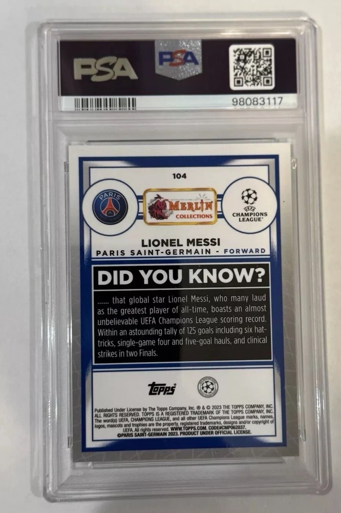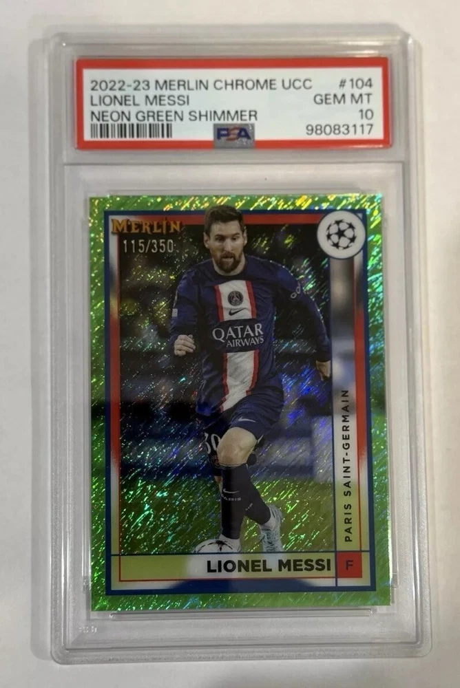 Capture a piece of soccer history with the 2022-23 Topps Merlin Chrome UEFA Champions League Lionel Messi Neon Green Shimmer sports trading card. This limited edition collectible, card number 350 from the series, features the legendary Argentine player in stunning detail, highlighted by the rare neon green shimmer refractor that makes it a standout in any collection. With a print run of just 150/350, this card is a must-have for soccer enthusiasts and serious collectors alike. As part of the prestigious 2023 Topps Chrome set, it exemplifies quality and exclusivity, celebrating one of the sport's most iconic athletes. Whether for display or as a treasured keepsake, this card is a testament to Messi's enduring legacy in the world of soccer.