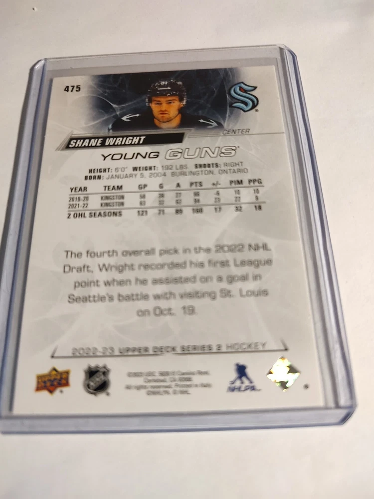 Elevate your ice hockey collection with the 2022-23 Upper Deck Series 2 - Young Guns #475 featuring Shane Wright. As a highly touted rookie card, it's a must-have for fans and collectors alike. Showcasing the promising talent of Shane Wright of the Seattle Kraken, this card is a tribute to his potential in the National Hockey League (NHL). Crafted by the renowned manufacturer Upper Deck, this piece is part of the base set and reflects the quality and attention to detail the brand is known for. For those who follow the sport or collect sports trading cards, this card represents a snapshot of Wright's inaugural season and is a tangible piece of sports history.