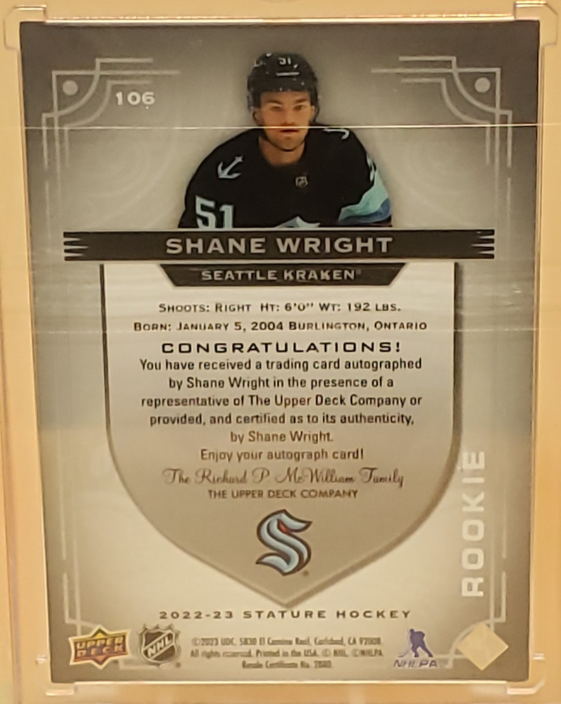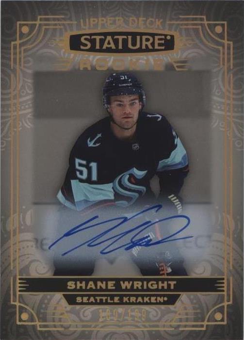 The product is a 2022-23 UD Stature Rookie Auto trading card featuring NHL player Shane Wright from the Seattle Kraken. The card is autographed by Wright in a hard-signed format and is part of the Splendid Skaters insert set. Manufactured by Upper Deck, the card is made of card stock and is an original piece sourced from the United States. It is a valuable collectible for fans of ice hockey and sports trading cards, especially for those interested in rookie cards and autographed memorabilia.