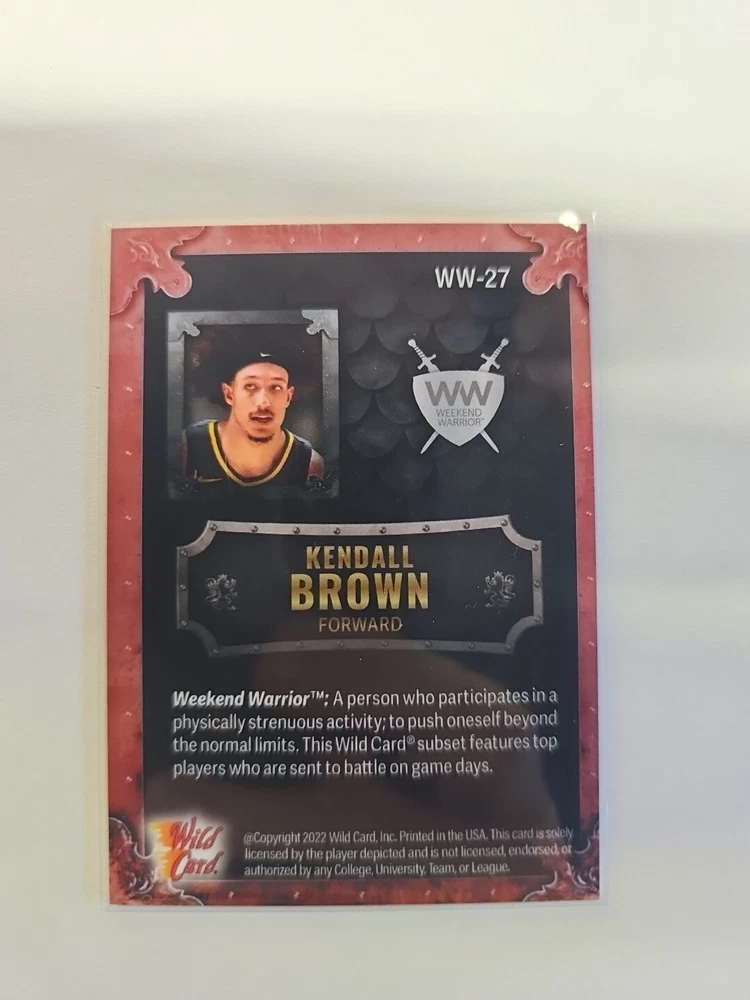 Elevate your collection with the 2022-23 Wild Card Matte Draft Weekend Warriors card featuring Kendall Brown. This limited edition sports trading card, numbered WW-27, boasts a unique White-Cobalt Frame / Blue Shield parallel/variety, making it a standout piece. As part of the coveted Weekend Warriors insert set, this card is serial numbered, reflecting its exclusivity with a print run of just 7/10. Crafted by Wild Card, this card captures the essence of the rookie basketball player, emphasizing his potential on the court. Manufactured in 2022, it represents a memorable moment from the 2022-23 season. For enthusiasts of sports memorabilia or collectors seeking to commemorate Kendall Brown's early career, this card is a worthy addition to any collection.