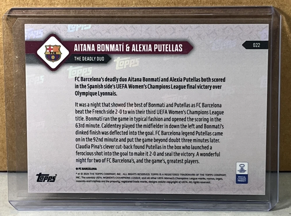 2023 24 TOPPS NOW UWCL #22 AITANA BONMATI & ALEXIA PUTELLAS FC BARCELONA the deadly duo Purple parallel serial #'d 60/99. Worldwide shipping available. U.S. - Winning bidder to add $3.99 for careful USPS first class shipping with delivery confirmation. Add .50 for each additional item. All other countries - ship costs are calculated by eBay through international shipping program. Please message if interested in multiple items. Bid with confidence, 49000+ feedback. Thanks and check out my auctions ending every Sunday. Please note that combined ship rates are for items paid for on one invoice, thanks!