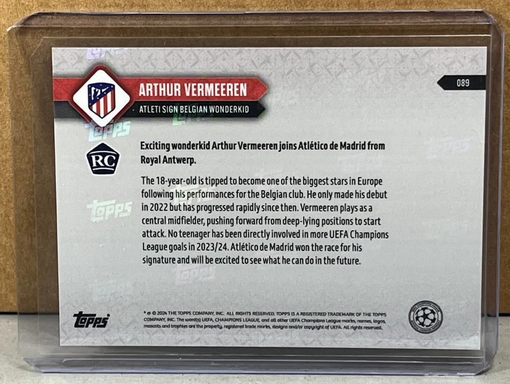 2023 24 TOPPS NOW #89 ARTHUR VERMEEREN ATLETICO DE MADRID ROOKIE Atleti sign Belgian wonderkid Black parallel serial #'d 6/10. Worldwide shipping available. U.S. - Winning bidder to add $9.99 for careful USPS first class shipping with delivery confirmation. Add .50 for each additional item. All other countries - ship costs are calculated by eBay through international shipping program. Please message if interested in multiple items. Bid with confidence, 49000+ feedback. Thanks and check out my auctions ending every Sunday. Please note that combined ship rates are for items paid for on one invoice, thanks!