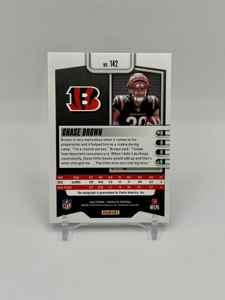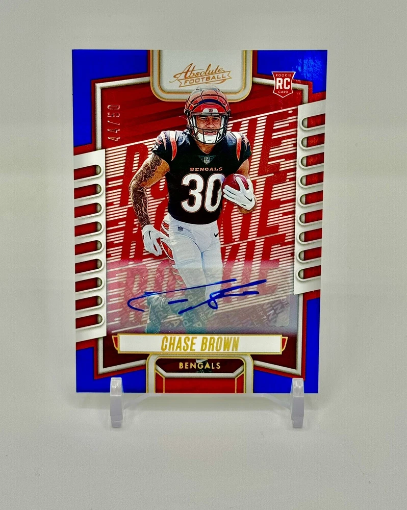 This 2023 Absolute Chase Brown Blue Spectrum Rookie Auto Autograph #16/50 Bengals SSP sports trading card is a must-have for any football fan. With its autographed feature, it is a unique and valuable addition to any collection. The card is manufactured by Panini and is part of the 2023 Absolute set, with a print run of only 100. The card is serial numbered and features the rookie Chase Brown, who played for the Cincinnati Bengals. It is a rare and special edition sports trading card, perfect for any collector or sports enthusiast. Get your hands on this valuable piece of sports memorabilia today.