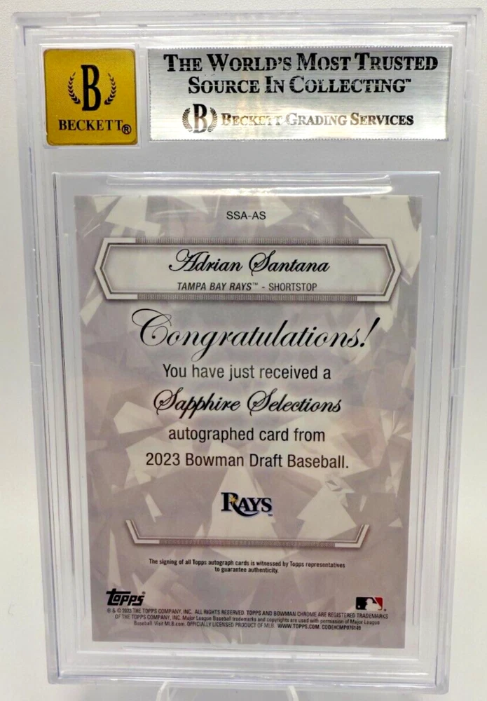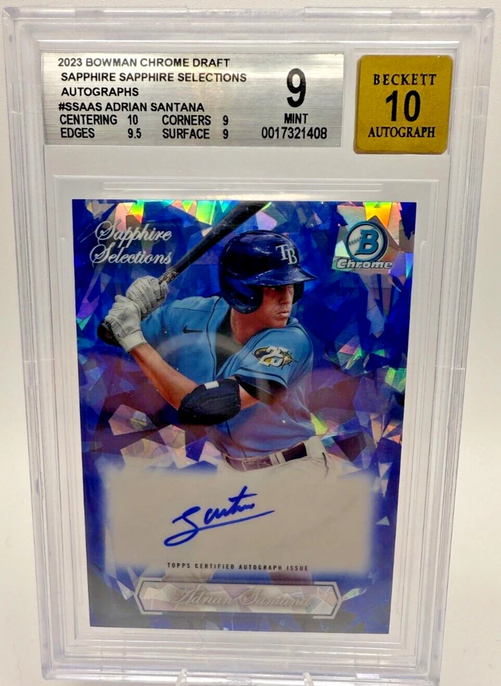 ๐ 2023 Bowman Chrome Draft Sapphire Selections Adrian Santana Autograph ๐ Add this stunning Adrian Santana Sapphire Selections Autograph card to your collection! Graded BGS 9 Mint with a perfect 10 Autograph , this card showcases Santana's signature and features the premium Sapphire design, making it a must-have for Tampa Bay Rays and MLB prospect collectors. ๐ก Key Features: Card Set: 2023 Bowman Chrome Draft - Sapphire Selections Player: Adrian Santana (Tampa Bay Rays) Grading: BGS 9 Mint (Subgrades: Centering 10, Edges 9.5, Corners 9, Surface 9) Autograph Grade: Beckett 10 (Perfect Condition) Team: Tampa Bay Rays Parallel: Sapphire Adrian Santana is an exciting prospect with impressive potential, and this card is a gem for serious collectors. Its stunning Sapphire refractor finish and on-card autograph make it stand out in any collection. ๐ Perfect for fans of Bowman Chrome Draft or collectors looking for investment-grade prospect cards! ? Visit My Store for More Collectibles! ? Love this item? Check out my eBay store for even more amazing comics, action figures, and collectibles! Click here ? ANM Collectibles to explore my full collection. Don't miss out on great deals?new items added regularly! ?