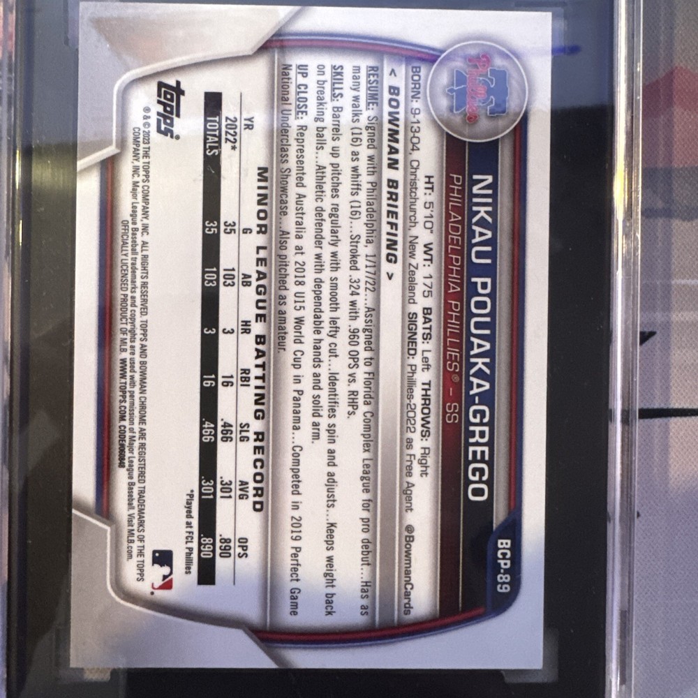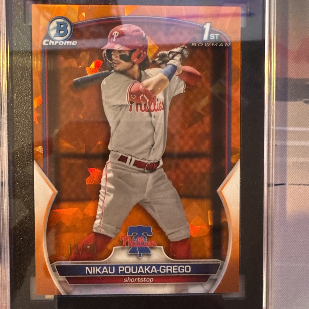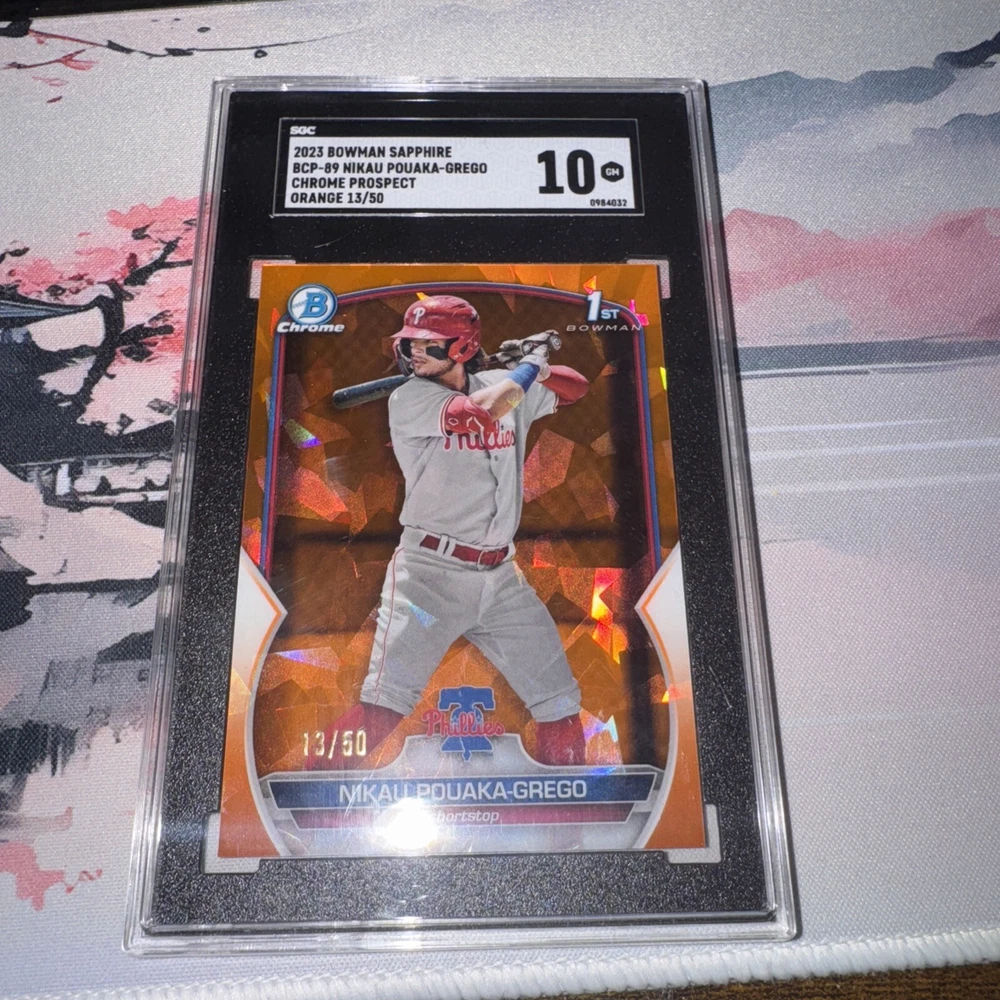 Capture the essence of baseball's future with the 2023 Bowman Chrome Draft Sapphire Prospects Orange Nikau Pouaka-Gredo card, a sought-after collectible for fans and investors alike. Serial numbered to ensure uniqueness, this card features the promising talent of Nikau Pouaka-Grego, of the Philadelphia Phillies, encapsulated in pristine detail by the Topps Co. Graded a perfect 10 by the Sportscard Guaranty Corporation (SGC), this single card is a testament to quality and craftsmanship. A modern-era gem from the 2023 collection, it's an original piece that celebrates the spirit of the sport and the potential of a rising star.