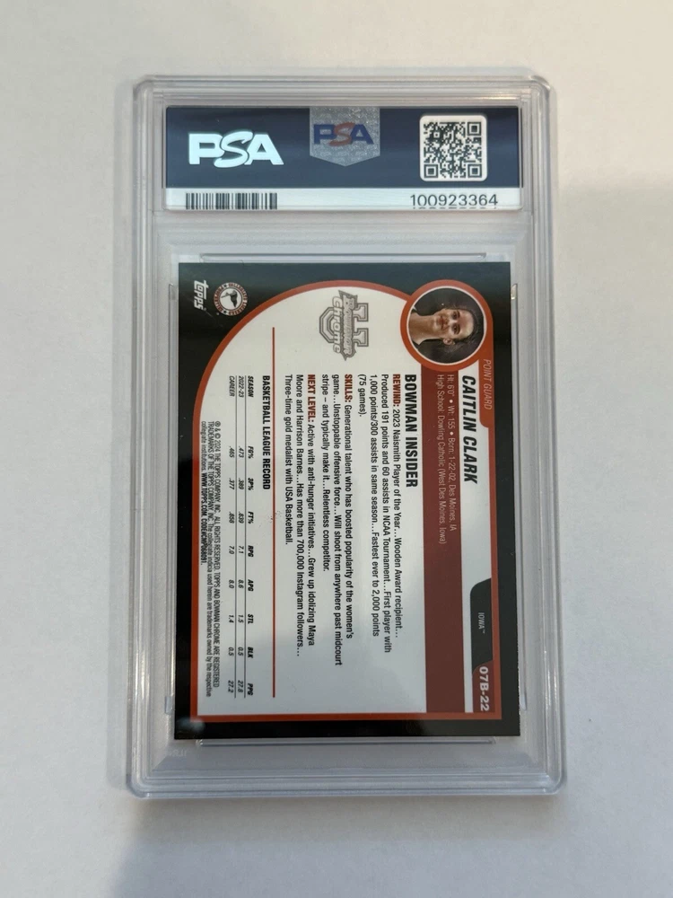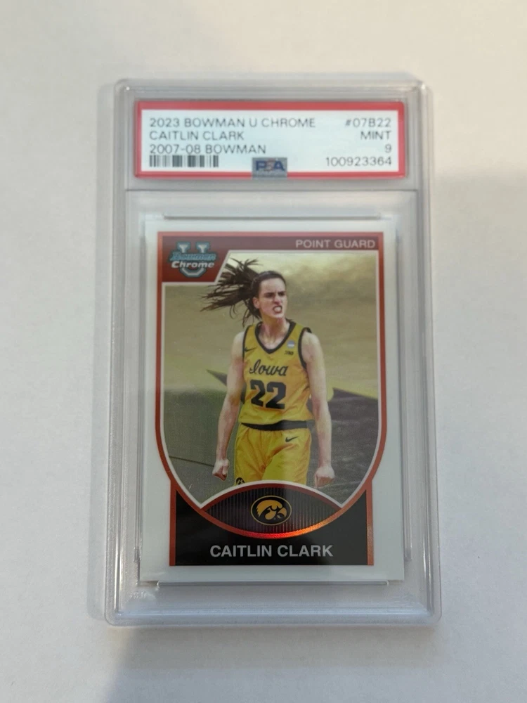 Elevate your collection with the 2023 Bowman University Chrome Caitlin Clark sports trading card. This mint-condition card, numbered 07B-22, showcases the Iowa Hawkeyes' standout player in all her rookie glory, making it a must-have for basketball enthusiasts and collectors alike. As part of the esteemed 2007-08 Bowman insert set, it holds a special place in the history of NCAA memorabilia. The card is a product of Topps' meticulous craftsmanship, reflecting the quality and attention to detail that the company is known for. Whether you're a fan of Caitlin Clark's impressive career, a follower of the Iowa Hawkeyes, or a connoisseur of finely-made sports trading cards, this item promises to be a treasured addition to your collection.
