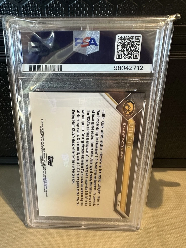 This is a 2023 Bowman trading card featuring Caitlin Clark of the Iowa Hawkeyes basketball team. The card is from the U Now set, with card number 41. It has been professionally graded by PSA as a perfect 10. This sports trading card does not have an autograph and is manufactured by Bowman for the National Collegiate Athletic Association (NCAA) basketball league.